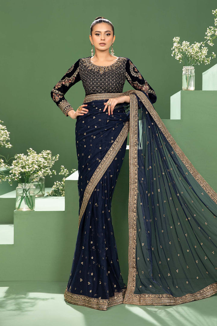 3 Piece Embroidered Net Saree  SFW2411-ESM-BLU