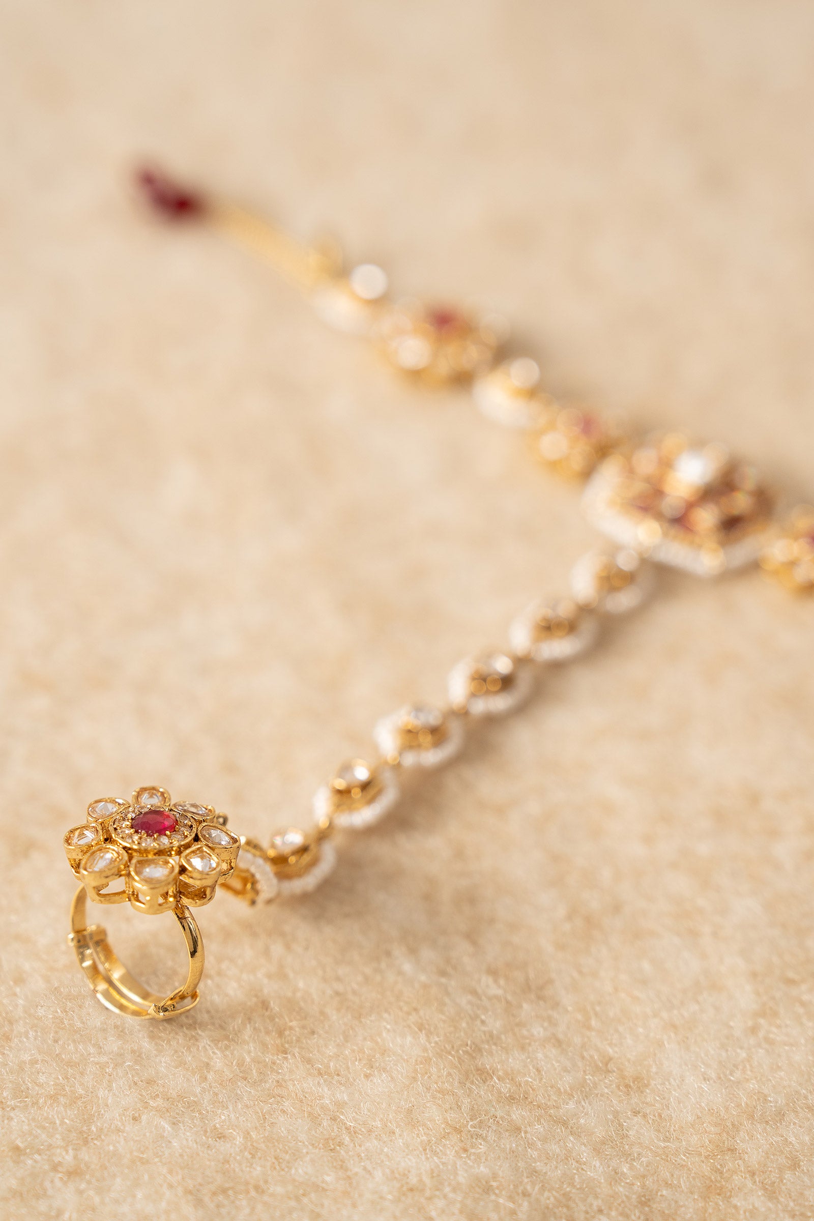This classic angla with adjustable ring embodies the essence of celebration with the richness of white handcut glass and pink chatham stones encaged with white zircons that beautifies your wrist and finger. Opt for opulence and emulate sheer class.Finish: 21K Gold PlatedLock: Spring LockProduct Care: Wipe Clean