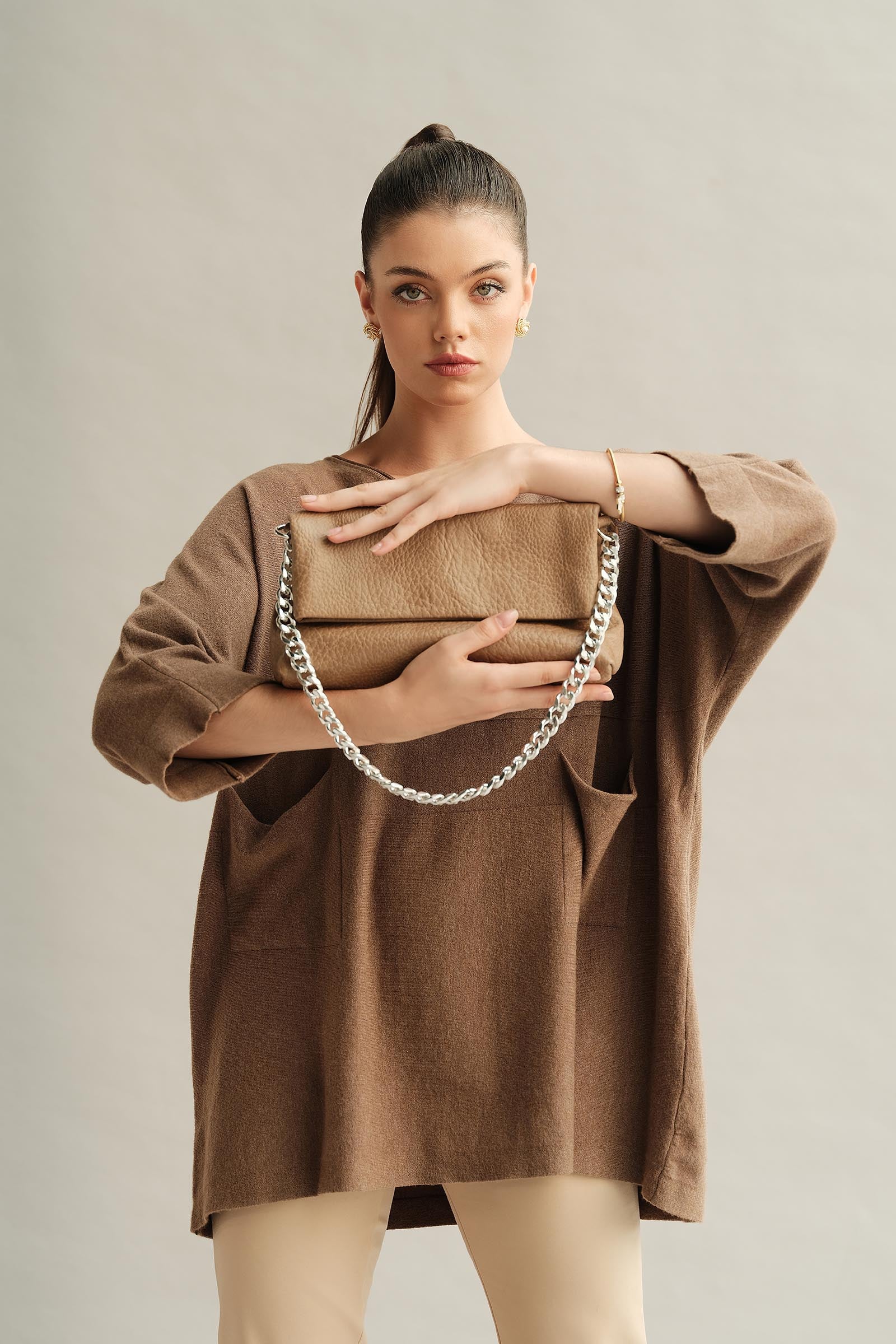 Crafted from a durable crocodile leather exterior and silver-tone hardware, this front flap handbag is your go-to accessory for an elevated style. Details: Hand Bag Metallic braided chain handle drop Adjustable strap Snap fastening Material: Leather Silver-tone hardware Interior Details: Single compartment One zipped inner pocket Color: Black, White & Khakhi Dimensions: 11”W X 10”H X 3”D