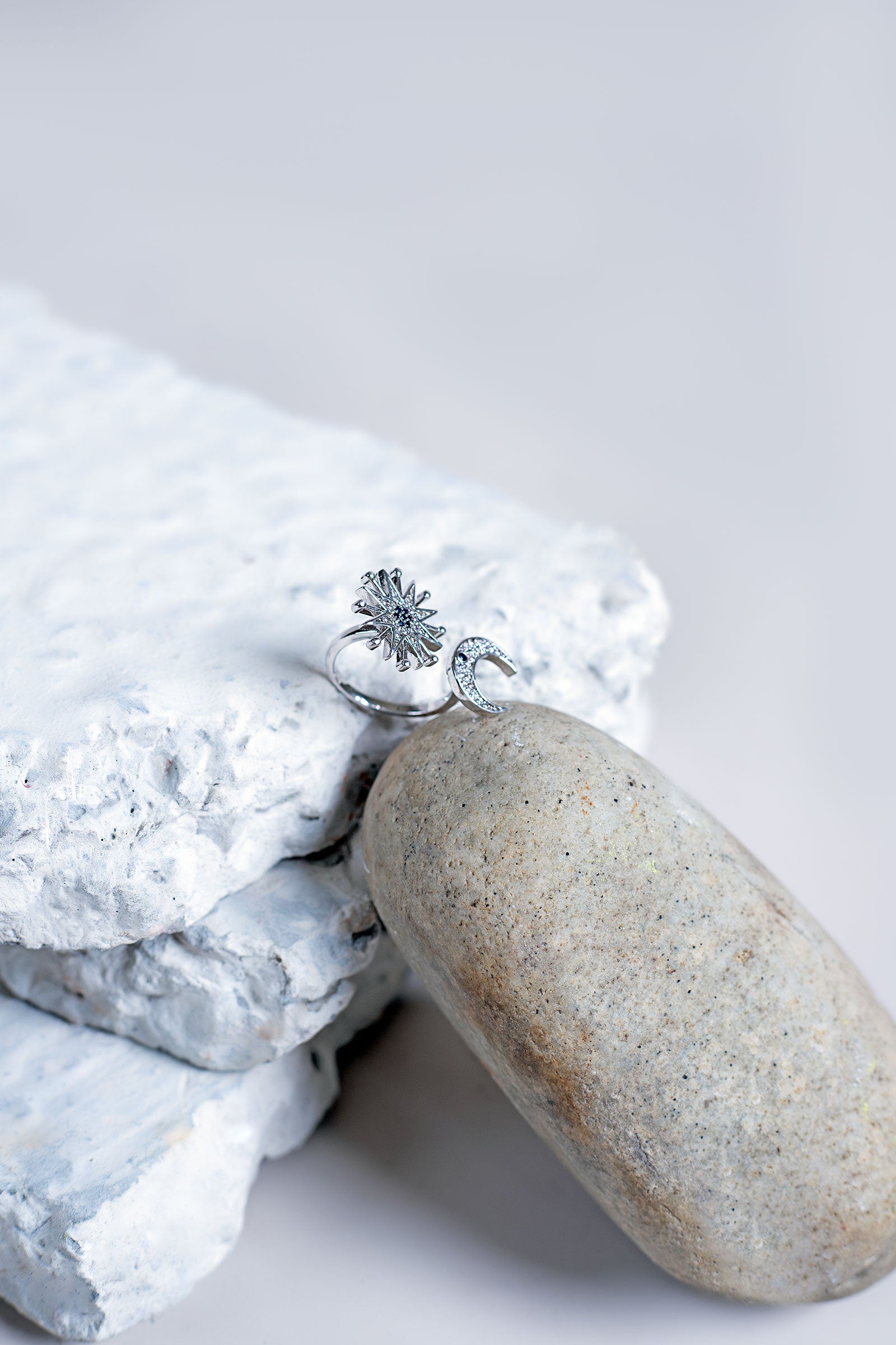 Exquisitely eye-catching; this ring features a delicate sun and moon design sparkling with clear crystals in a gleaming silver tone to elevate your style.