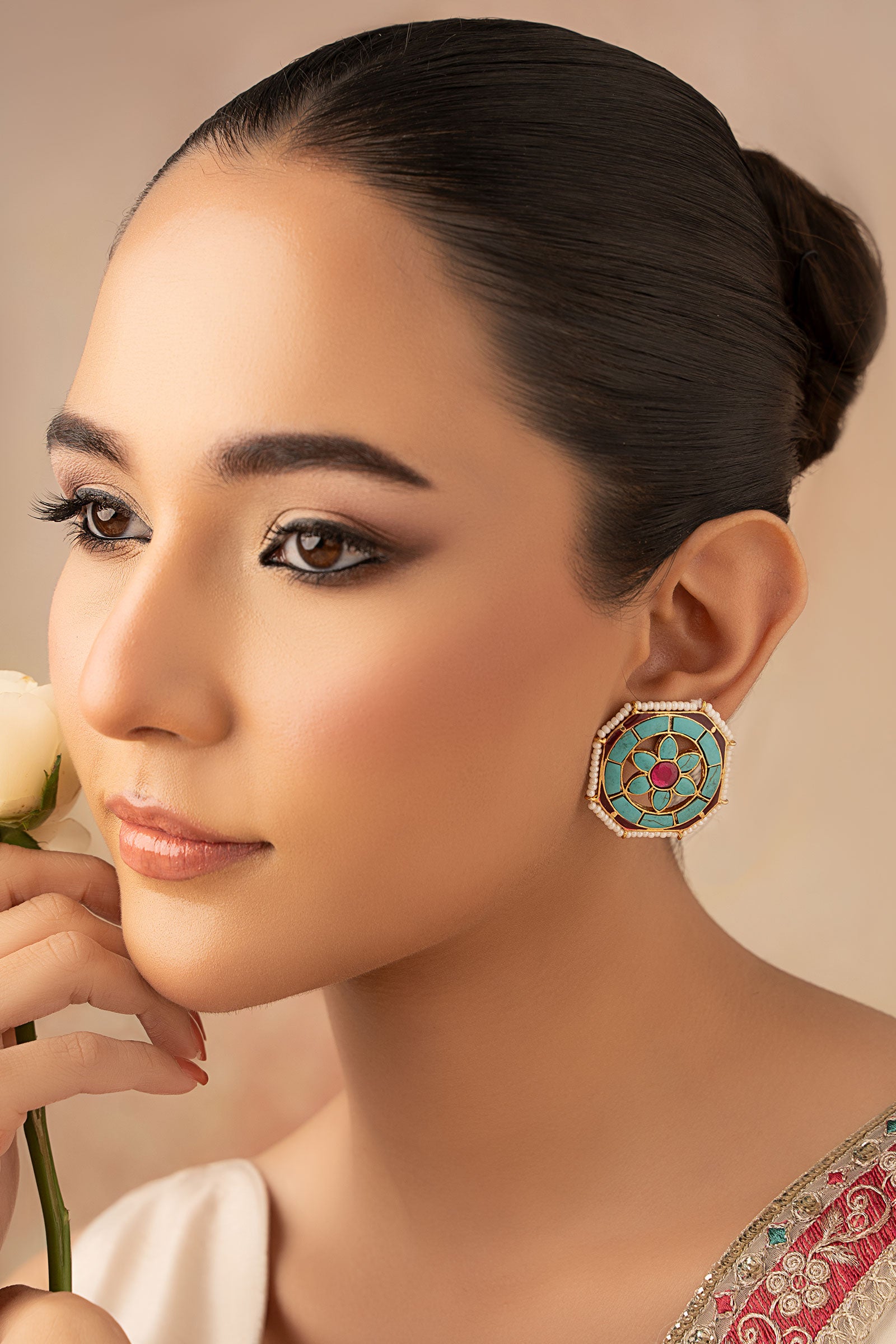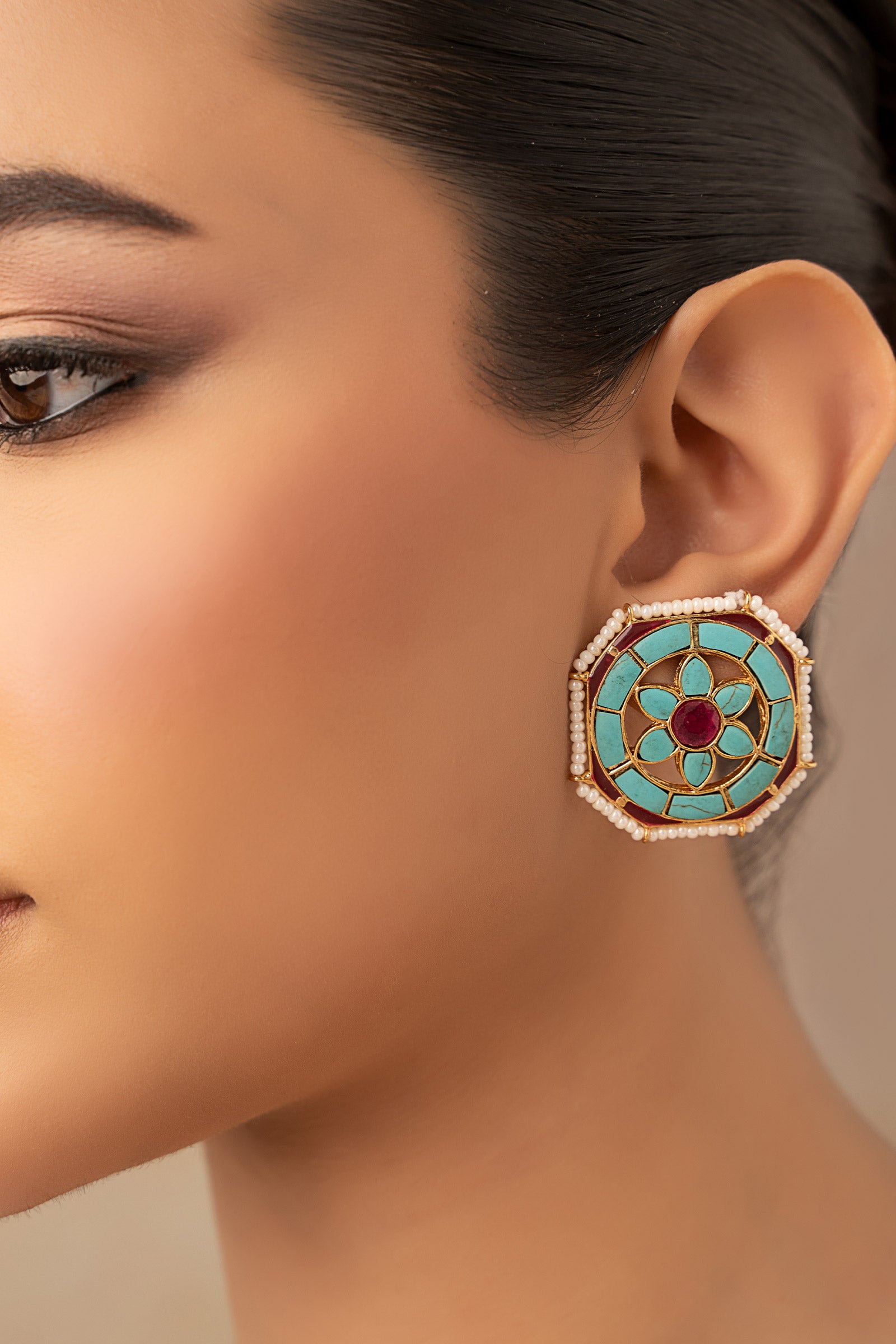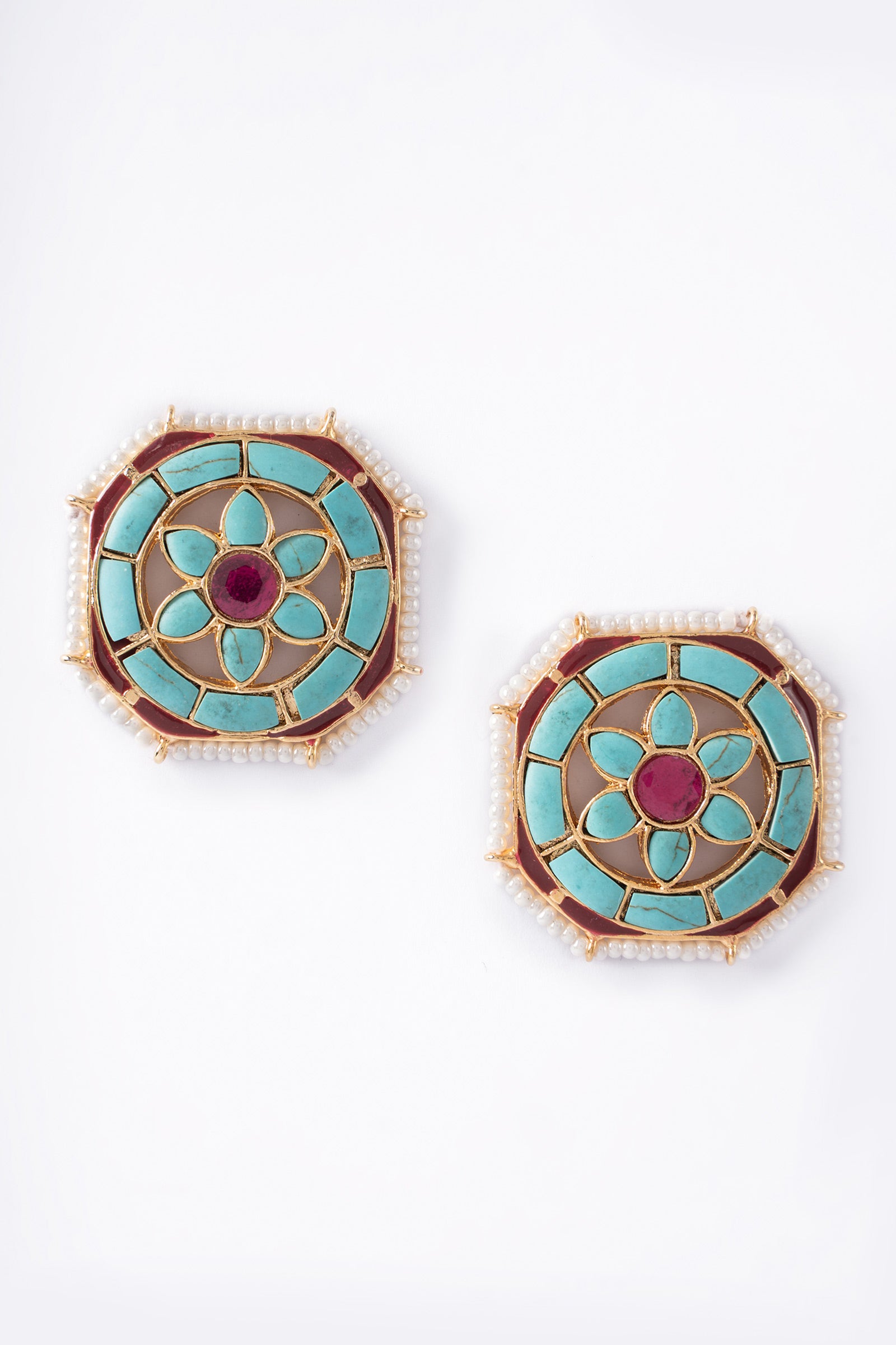 Bringing you a timeless edition, our Avira Studs showcase a majestic artistry of pink chatham rendezvoused with turquoise and red enamel, designed to add a subtle glow to any look. It is a must-have for everyday elegance. Finish: 21K Gold Plated Back Pin: Sterling Silver Stud Product Care: Wipe Clean