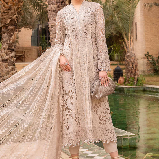 ShirtEmbroidered Organza Neckline Patch With 3D Flowers & PearlsEmbroidered Lawn Neck PattiDobby Lawn Center Front With 3D LaceEmbroidered Lawn Side Panels Dobby Lawn Back & Sleeves Embroidered Lace For SleevesEmbroidered Sleeves PatchEmbroidered Organza Sleeves & Side Panel PatchesEmbroidered Organza Ghera & Sleeves Patti With 3D FlowersDupattaPoly Organza Burnout DupattaTrousersDyed Cambric TrouserColor: Ivory