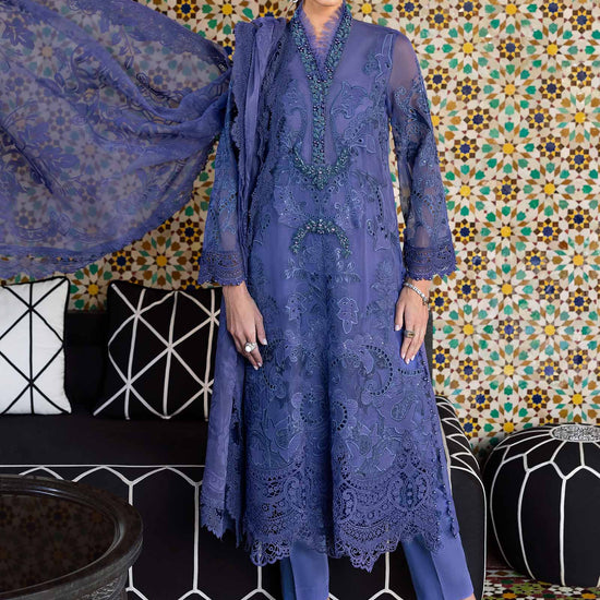 ShirtEmbroidered Organza Center Panel With Lawn AppliqueEmbroidered Organza Side Panel Right With Lawn AppliqueEmbroidered Organza Side Panel Left With Lawn AppliqueEmbroidered Organza Neck Patti With Hand EmbellishmentEmbroidered Organza Neck Patch I With Hand EmbellishmentEmbroidered Organza Neck Patch II With Hand EmbellishmentEmbroidered Sleeve LaceEmbroidered Ghera LaceEmbroidered Organza SleevesDyed Organza BackFabric: OrganzaColor: VioletUndershirtDyed UndershirtFabric: LawnColor: VioletTrousersDyed TrouserFabric: CambricColor: VioletDupattaDyed Burnout DupattaFabric: OrganzaColor: VioletNote: Dry Clean Only