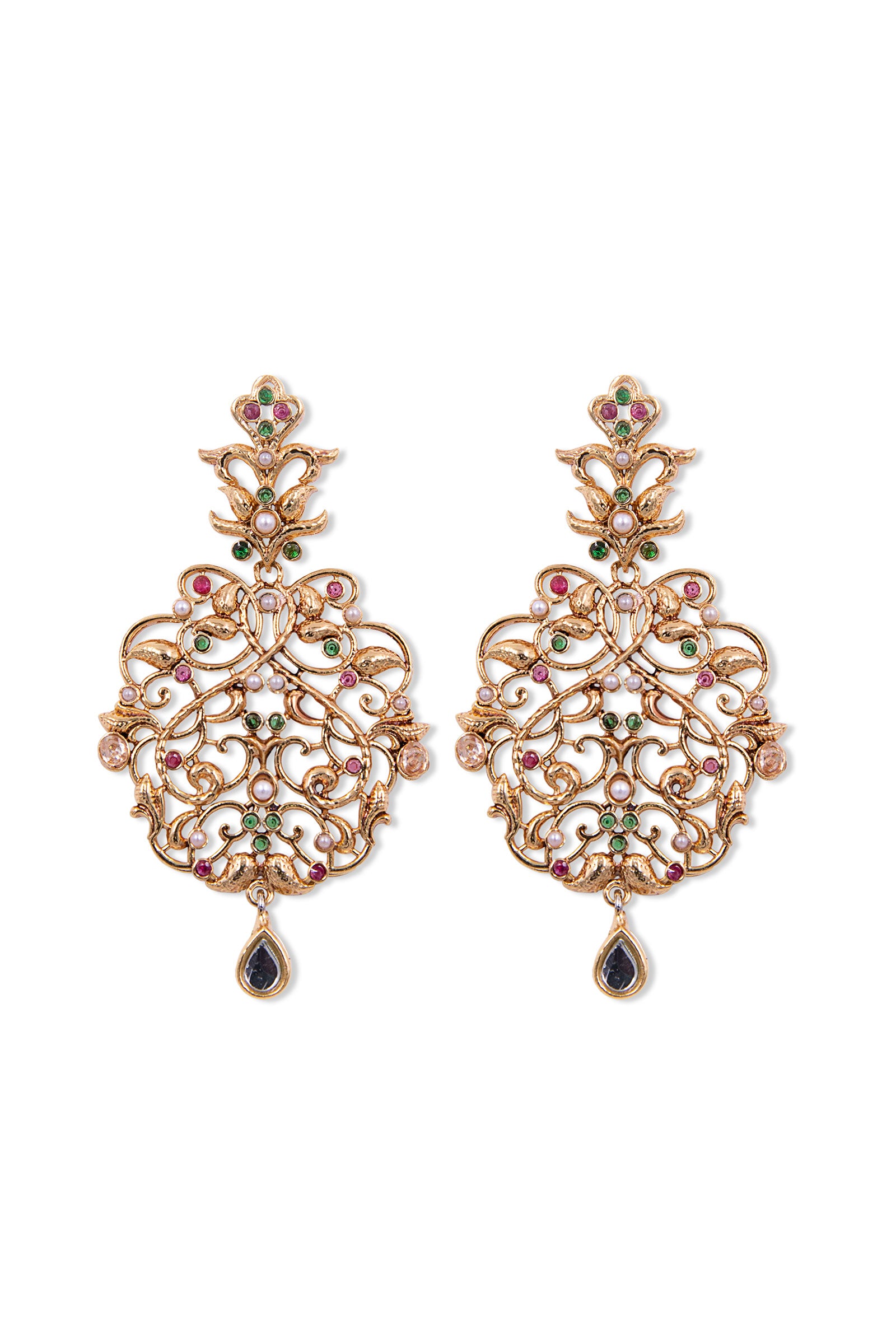 Create an unforgettable look with our 'Dahlia Earrings' - Crafted with hand-cut glass stones intertwined with multicolor zircons, pearls & a hint of pink Chatham that perfectly contributes to undying grandeur at your festivities. Finish: 21K Gold Plated Back Pin: Sterling Silver Stud Product Care: Wipe Clean