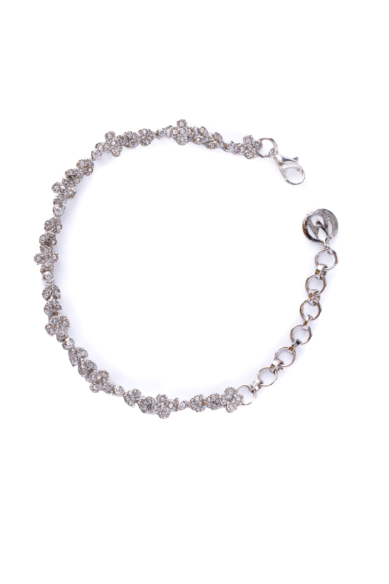 Complete your quintessential look with this captivating traditional Duskstar Bracelet. It features delicate floral motifs embellished with white zircons, making it a perfect accessory for an elevated look. Finish: Silver Lock: Spring Lock Product Care: Wipe Clean