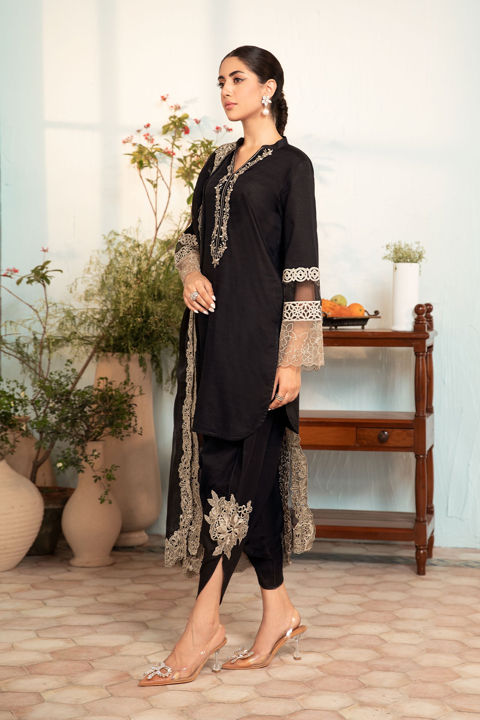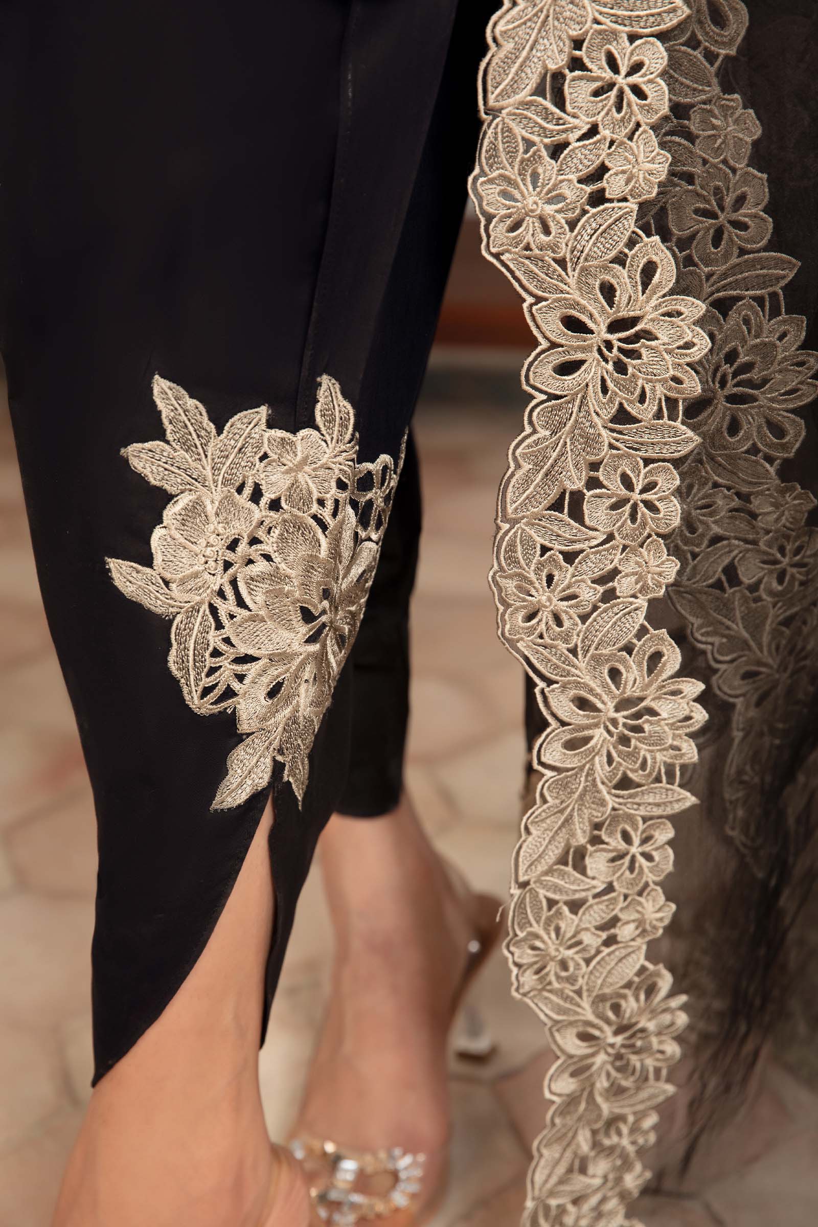 Dobby straight embroidered shirt with embroidered sleeves cambric tulip trousers. Organza dupatta four sides embroidery dissolving lace.