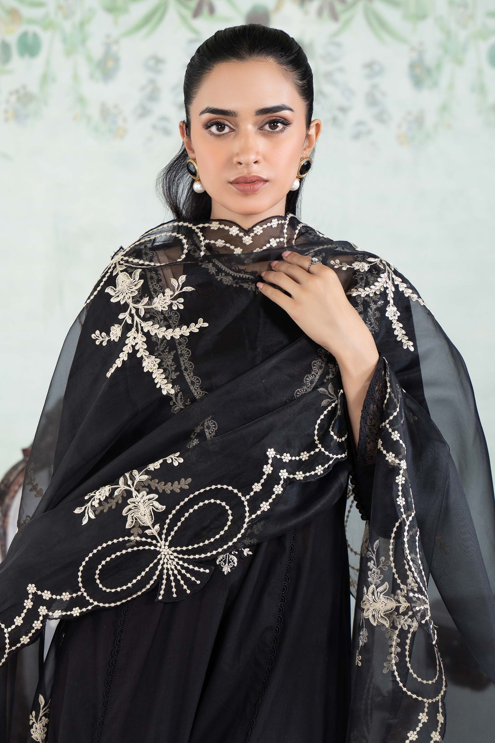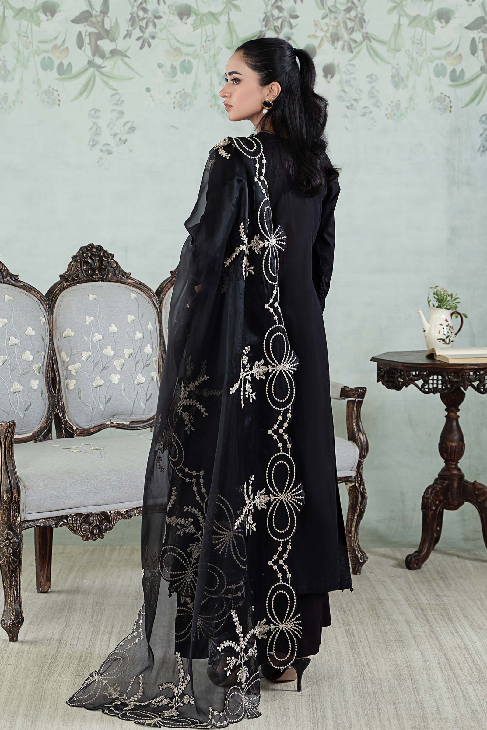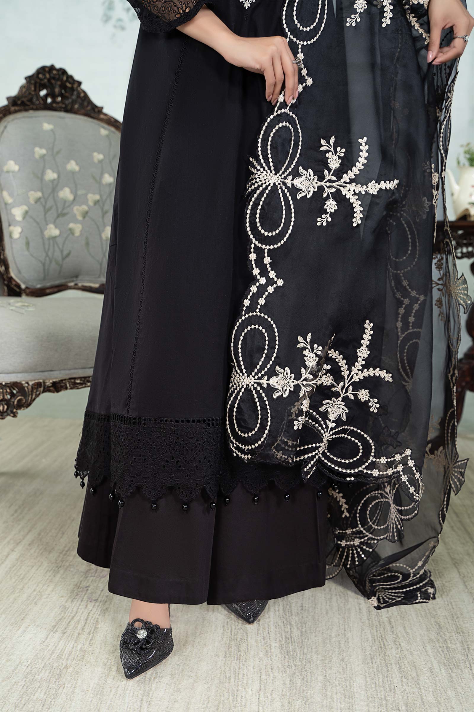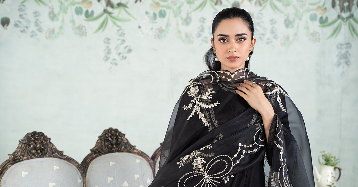 Shirt Dyed FrockEmbroidered Round Neckline With Sequins & Pearl DetailingPress Button On Neck Loop Button PlacketLace Detailing On Side PanelsChickenkari Embroidered Border With Pearl DetailingFull Length Sleeves With Chickenkari Embroidered BorderLoop Button Detailing On SleevesDyed BackFit: RegularColor: BlackFabric: LawnTrousersDyed Dhaka TrousersElasticated WaistbandFit: RelaxedColor: BlackFabric: CambricDupatta Dyed DupattaSequins Embroidered BordersColor: BlackFabric: OrganzaModel is wearing size xsNote: Only Dry Clean