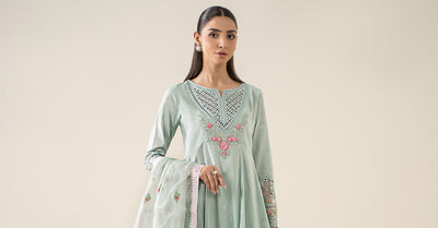 Schiffli Embroidered Round Neckline With Motif & V-Cut Detailing