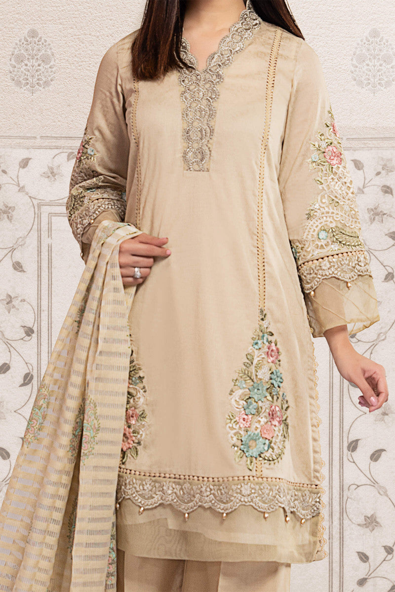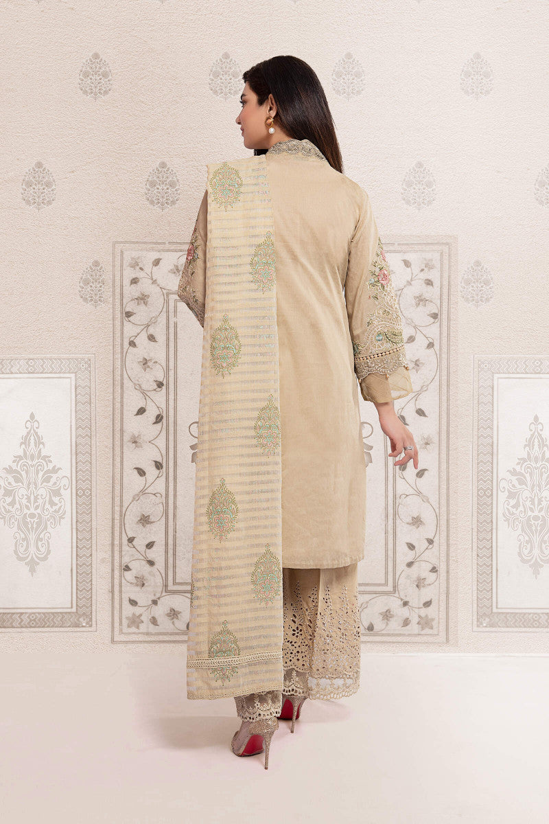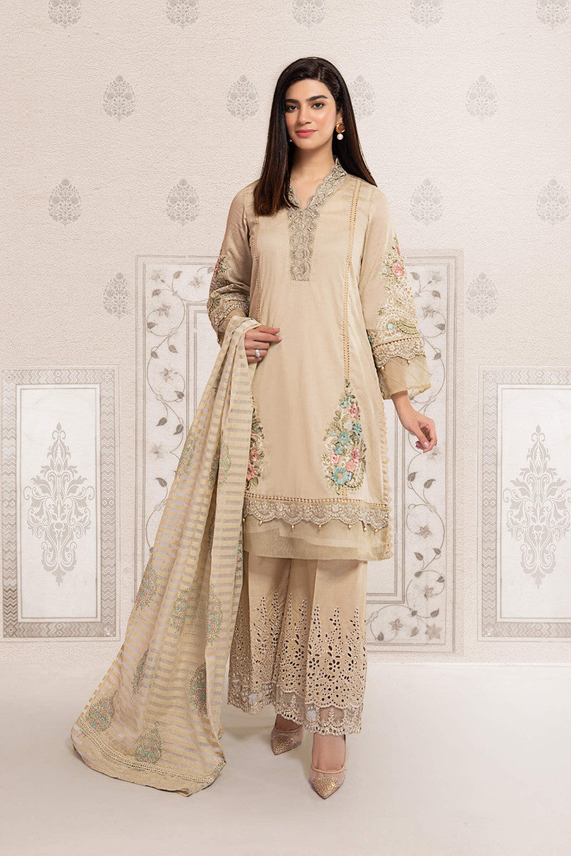 3 Piece Shirt fabric: Lawn Trouser fabric: Lawn Dupatta: Organza Straight shirt with panels embroidered neckline, Embroidered ghera border and embroidered sleeves border Paired with schiffli embroidered trouser and printed dupatta with lace