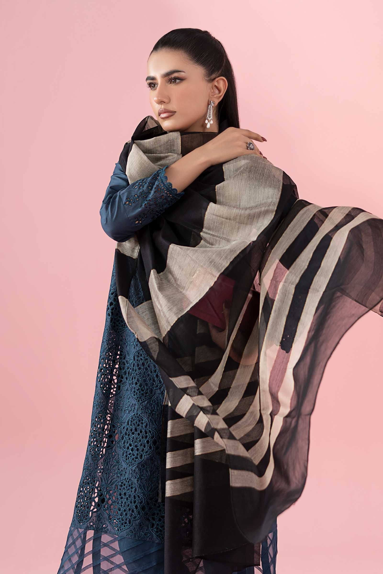 3 Piece Shirt Fabric: Lawn Schiffli Trouser fabric: Cotton Lawn Dupatta fabric: Khaddi Weaved Full front schiffli straight shirt with embroidered neckline. Front detailed with organza pleats and laces on hem. Schiffli sleeves. Paired with matching straight pants and khaddi weaved dupatta in contrast colors