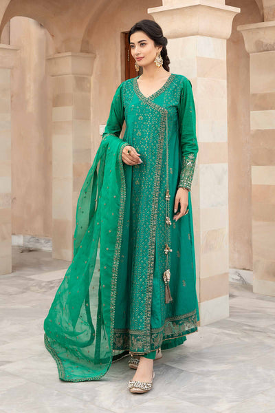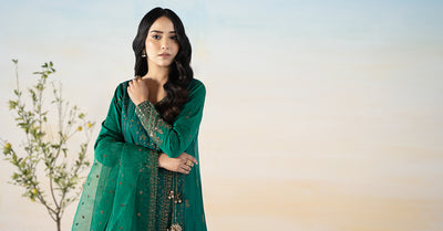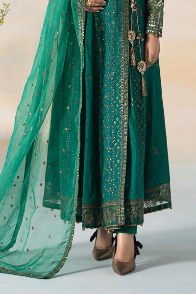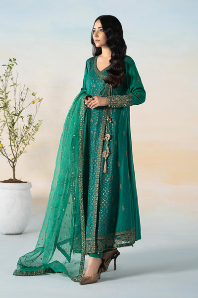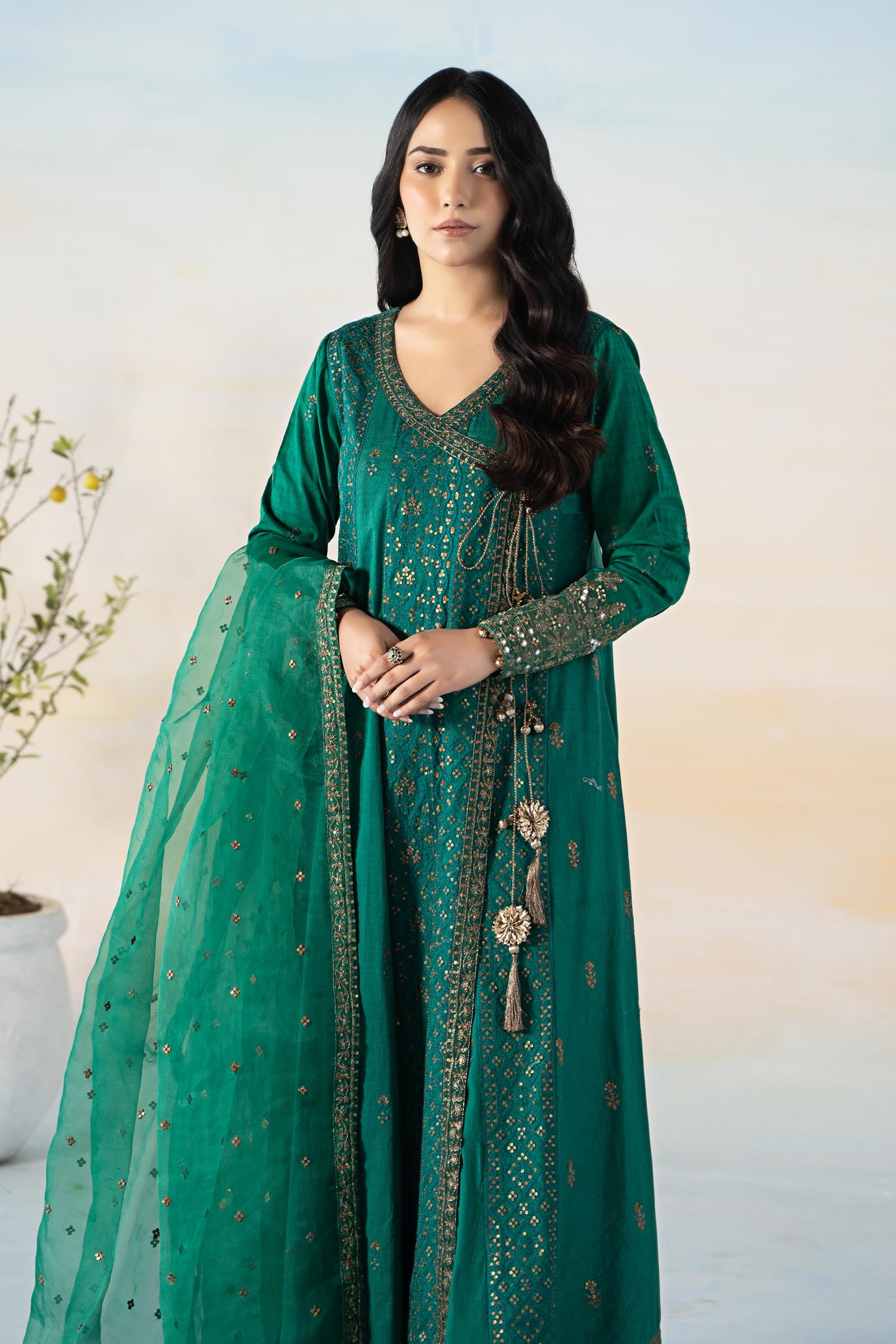 A vision of redefined elegance; our three-piece embroidered dobby suit unveils an angrakha, intricately woven with tilla embroidery and panni work. It is paired with dyed straight-fit trousers and an embroidered dupatta that instantly steals the spotlight.