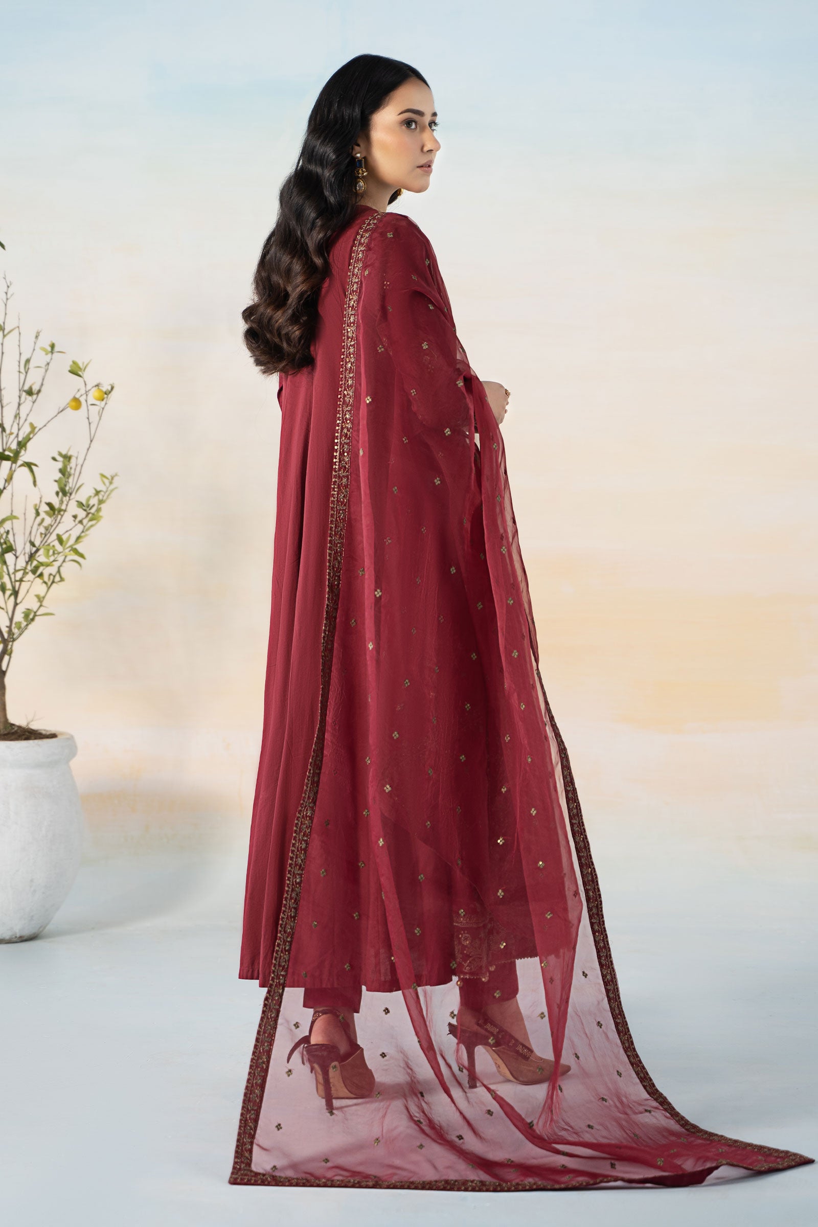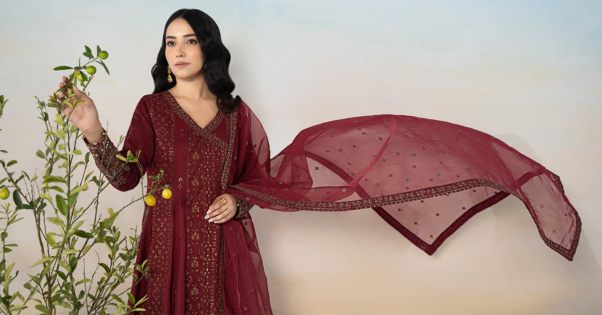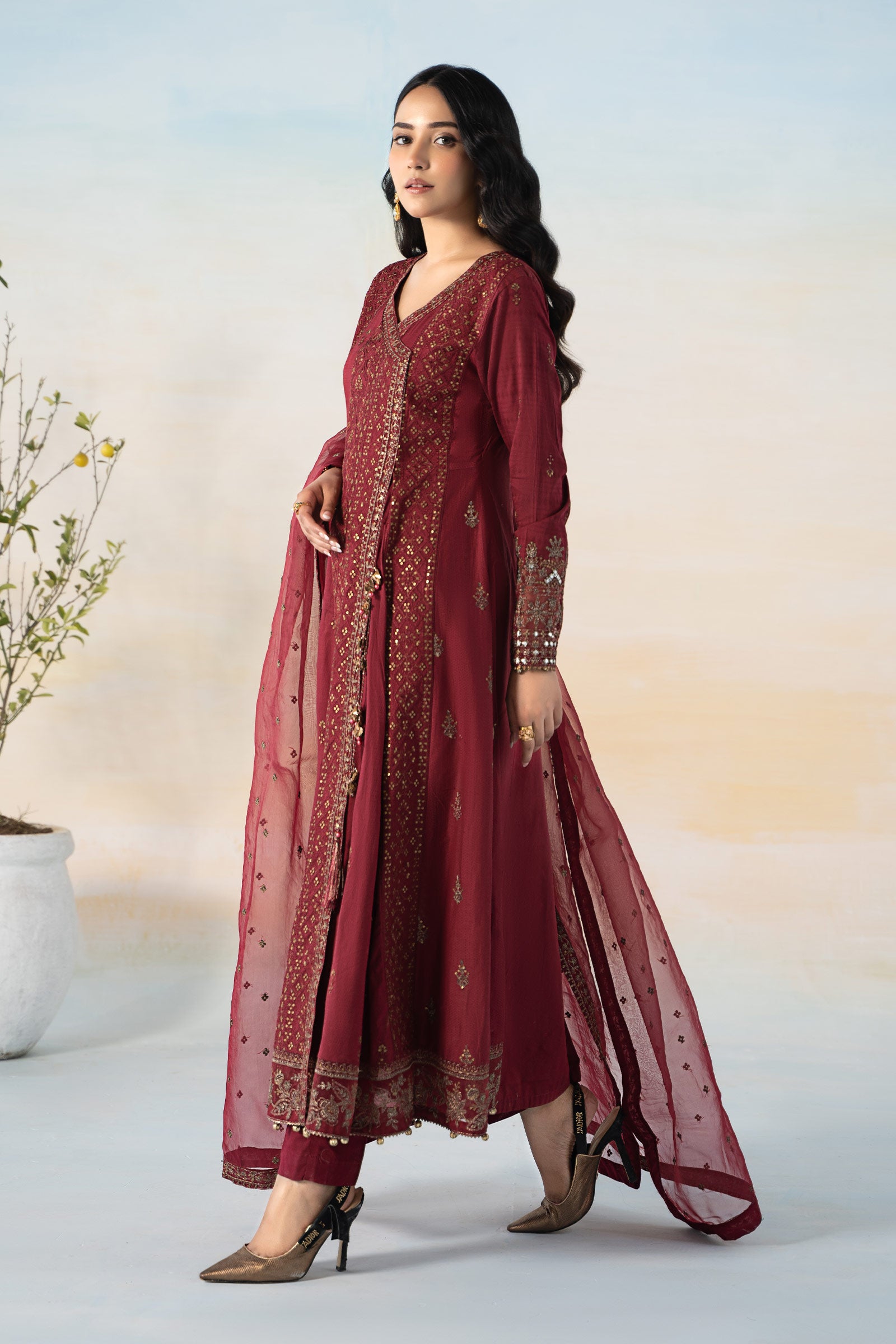 A vision of redefined elegance; our three-piece embroidered dobby suit unveils an angrakha, intricately woven with tilla embroidery and panni work. It is paired with dyed straight-fit trousers and an embroidered dupatta that instantly steals the spotlight.
