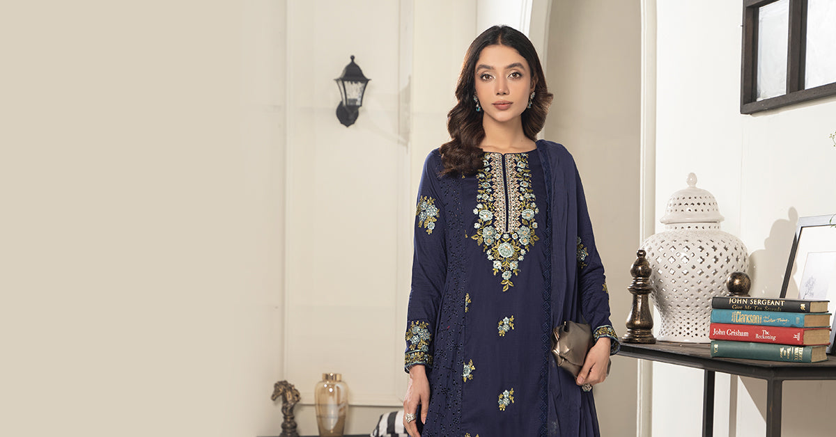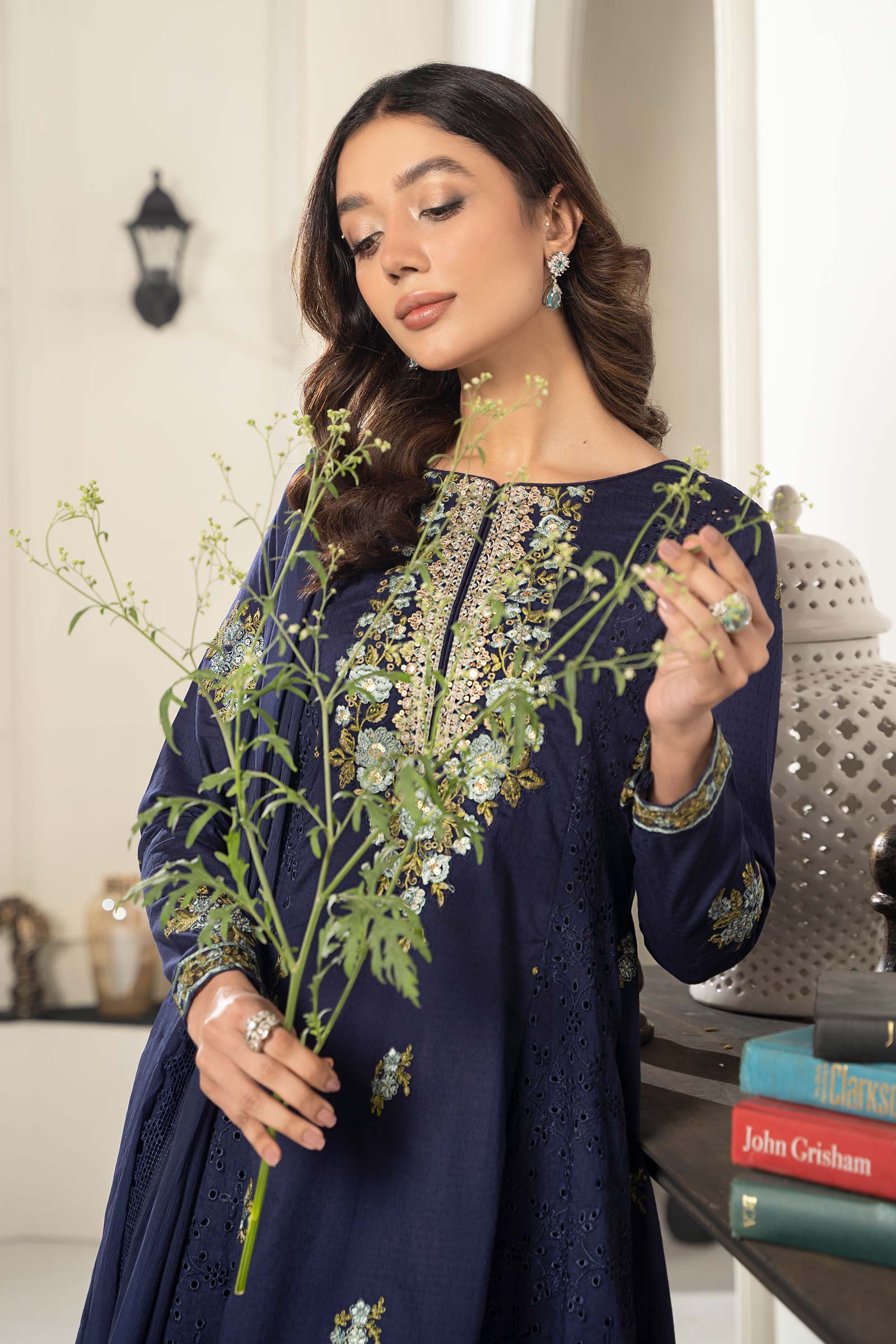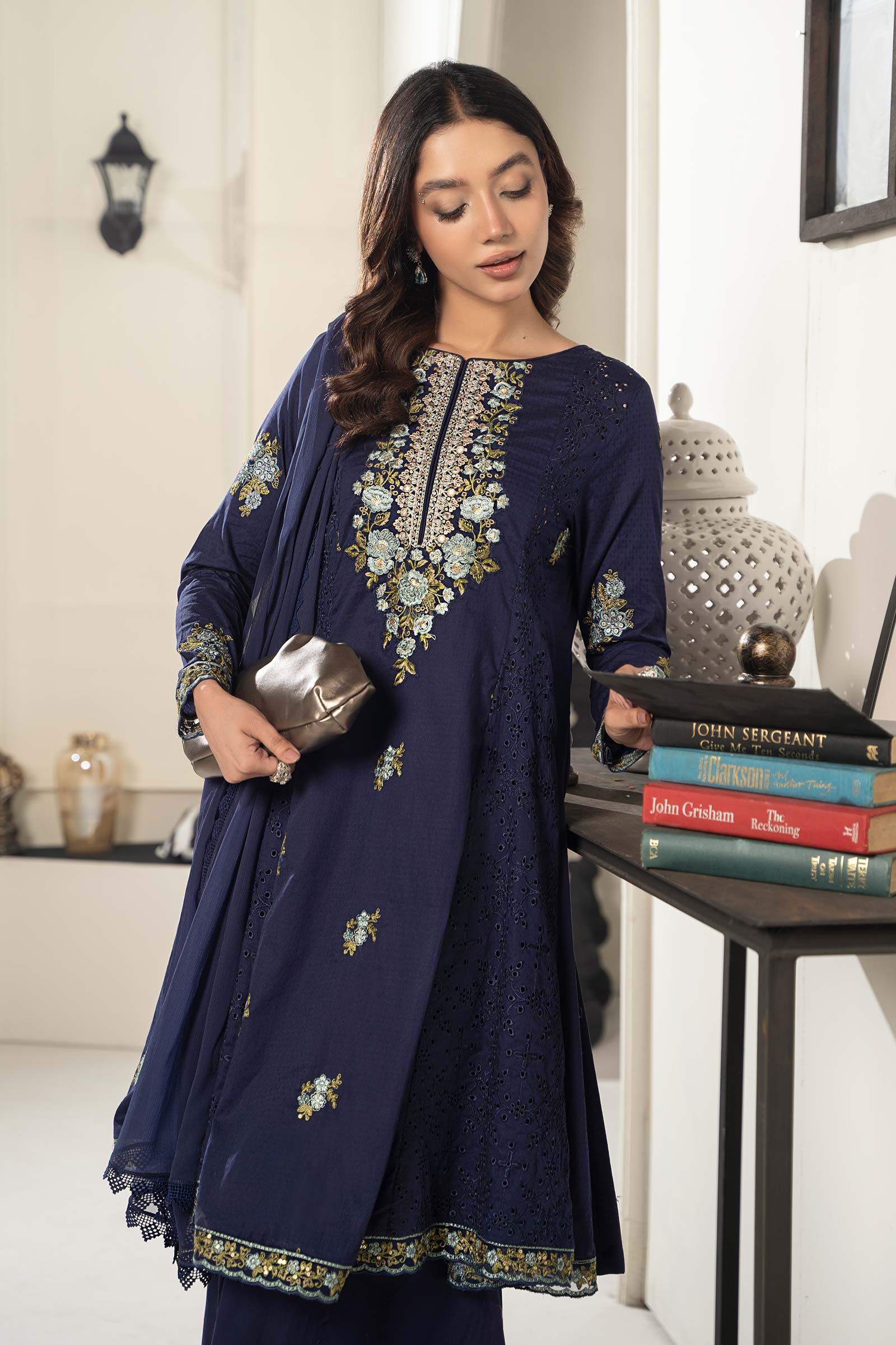 Creating a symphony of timeless beauty and redefined elegance with our three-piece embroidered dobby suit, unveiling a graceful floral embroidered canvas intricately crafted with schiffli panels. This masterpiece is elevated with dyed wide-leg trousers and a dupatta, detailed with lace borders to instantly steal the spotlight!