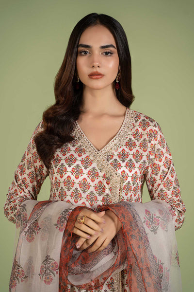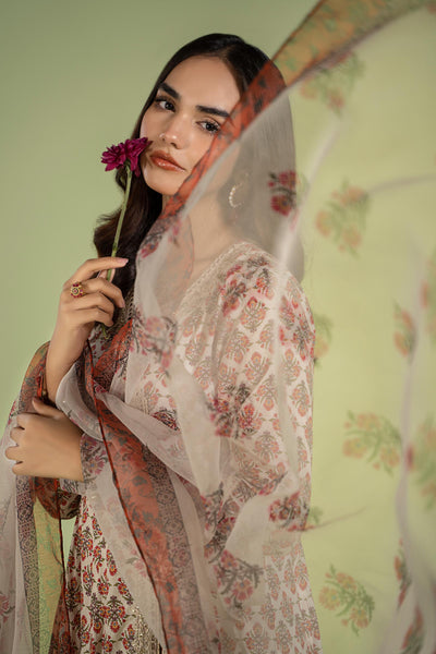 Combining tradition with timeless allure with our three-piece embroidered lawn suit, featuring a classical sequin and tilla embroidered angrakha elevated with contrast cuff sleeves, adding to its allure is the pearl detailing and gotta tassels. This masterpiece is paired with a dhaka pajama framed with a gotta lace hem and a floral printed dupatta, making it an effortless choice for everlasting summers.
