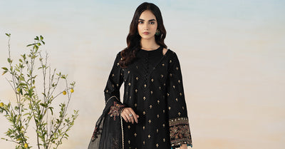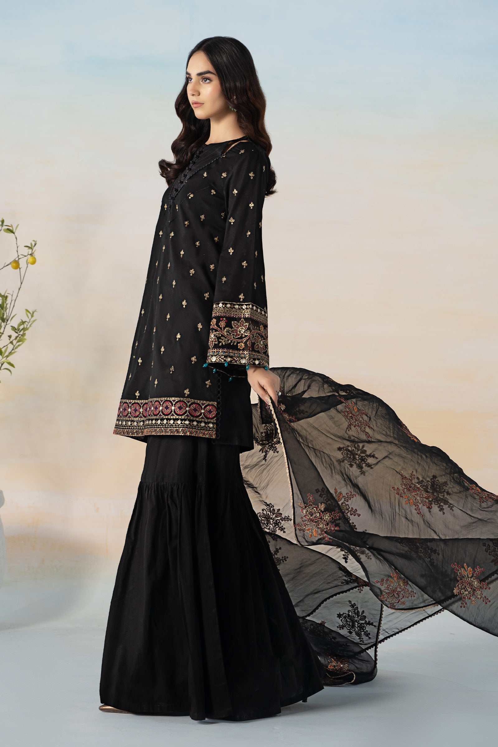 Captivate with our bewitching three-piece embroidered jacquard broshia suit that weaves an intricate symphony of floras with enchanting jacquard patterns and meticulous embroideries clad with sequins & tilla work. Enveloped with delicate ornaments & tilla balls detailing and accompanied by dyed gharara and a dupatta boasting sequins and tilla embroidered floral motifs, this ensemble seamlessly harmonizes modern trends with timeless traditions for ever-lasting elegance.