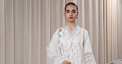 Step into floral fantasy with our three-piece embroidered dobby suit, showcasing an exquisite schiffli-crafted straight shirt, woven with floral embroidered motif and cutwork, this divine creation encapsulates the epitome of refined elegance with pearl interlaced with scalloped embroidered organza tassel lace. Framed with dyed straight trousers and a floral printed dupatta adorned with scalloped embroidered borders, it is perfect to turn every moment into a mesmerizing escapade.