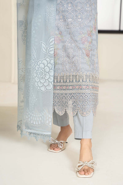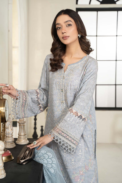 An epitome of refined elegance; our three-piece embroidered self-jacquard suit showcases an exquisitely crafted shirt weaving intricate florals and tribal elements with sequins, tilla, and thread embroidery. Adorning the sleeves with meticulous scalloped detailing that graces the overall look. Resplendent in an ice-blue hue, this masterpiece is heightened by dyed straight-fit trousers and a broshia dupatta framed with scalloped lace borders.