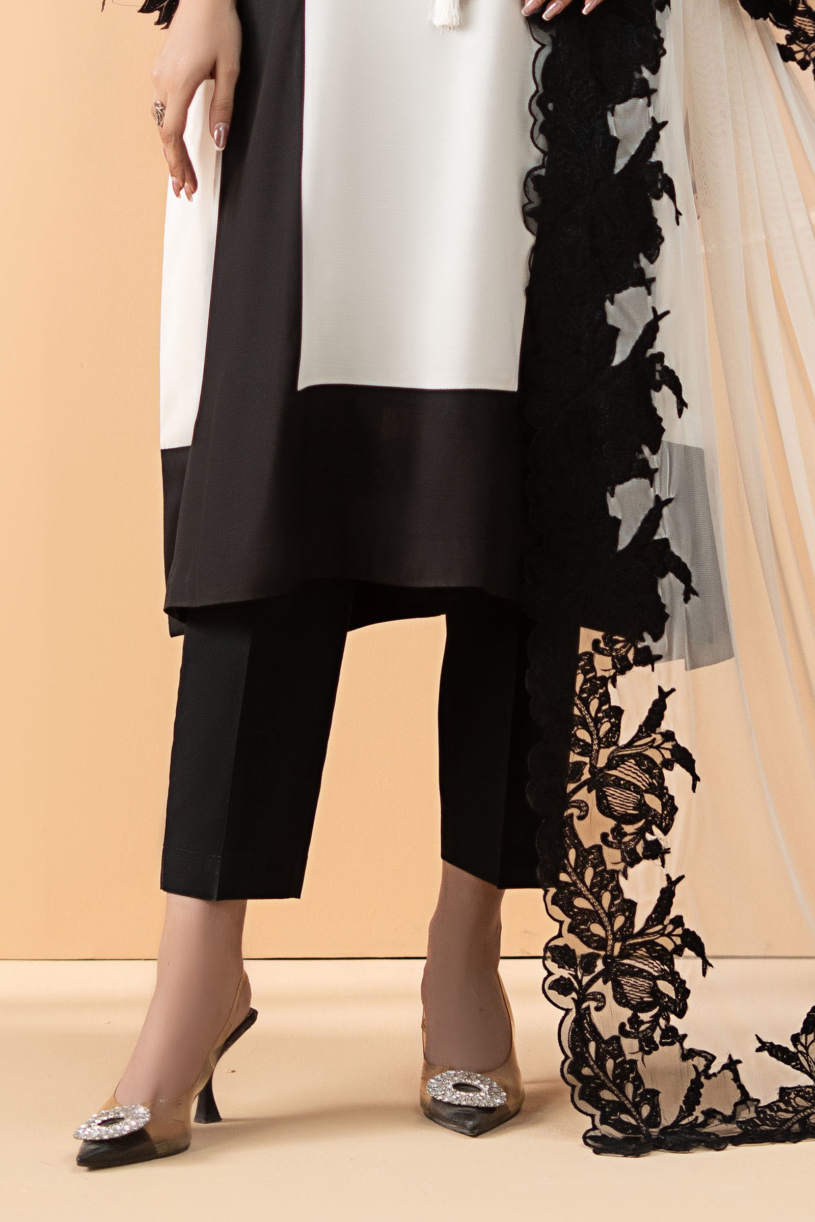ShirtSolid Straight-Cut ShirtDiamantes Embellished Neckline With TasselStraight Sleeves With Embroidered BorderColor: Off-White & BlackFabric: Pk Raw SilkTrouserSolid Straight TrouserElasticated WaistbandColor: BlackFabric: CambricDupattaSolid DupattaFour-Side Embroidered BorderColor: Off-White & BlackFabric: NetModel is wearing xs sizeNote: Dry Clean Only