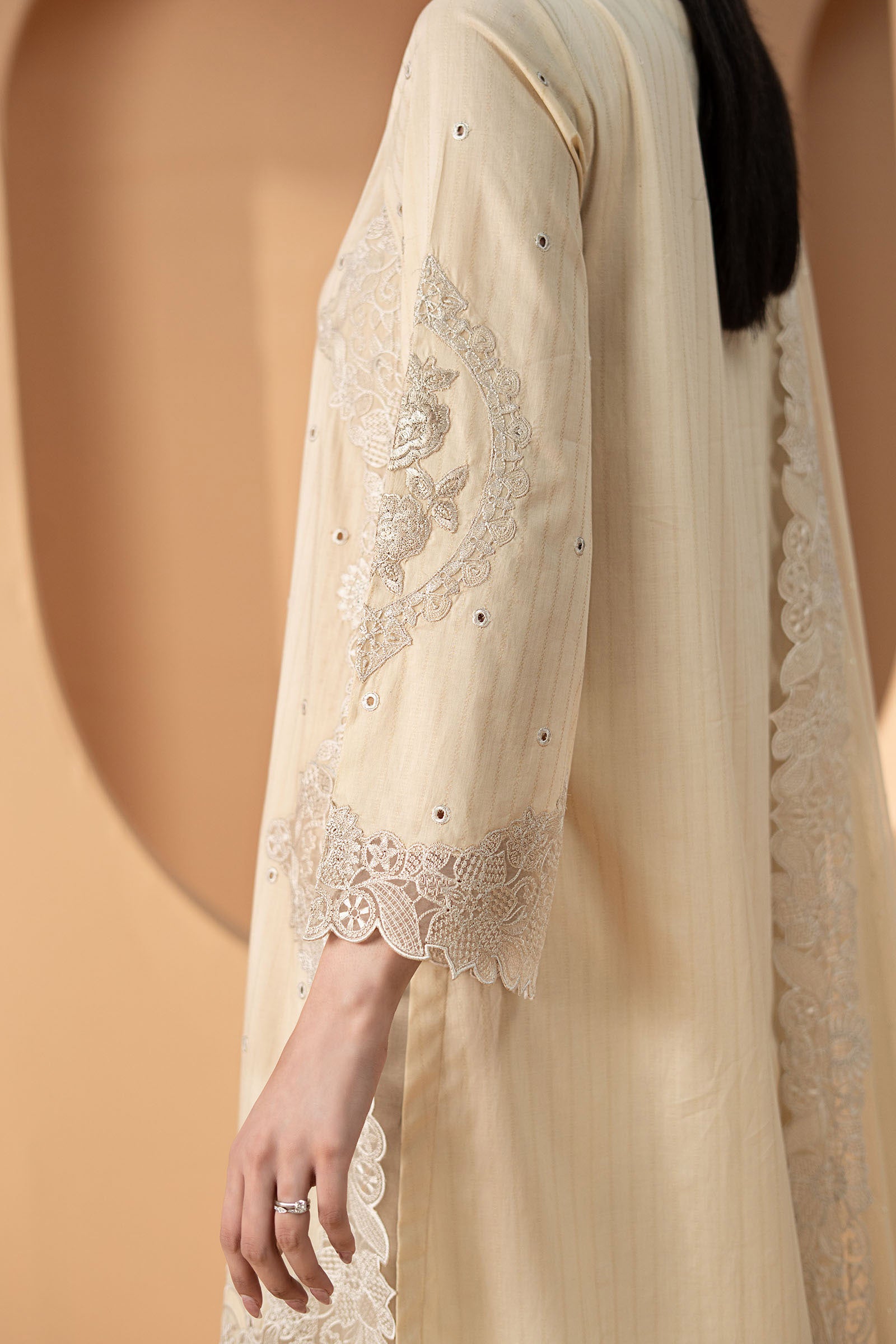 ShirtEmbroidered ShirtRound NecklineEmbroidered Straight SleevesColor: BeigeFabric: Dobby LawnTrouserSolid Straight TrouserElasticated WaistbandColor: BeigeFabric: CambricDupattaDiamantes Embellished DupattaFour-Side Embroidered DupattaColor: BeigeFabric: NetModel is wearing xs sizeNote: Dry Clean Only