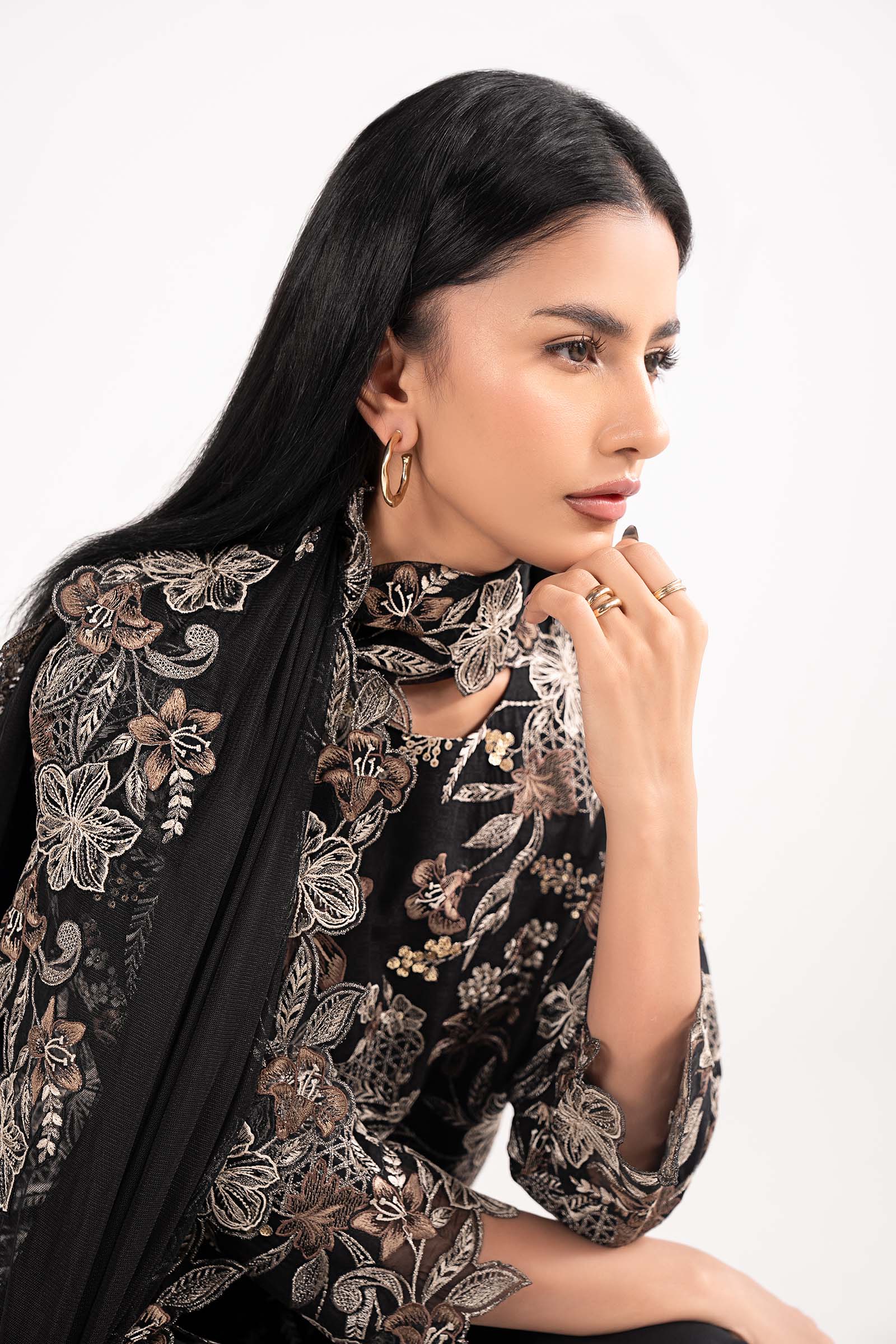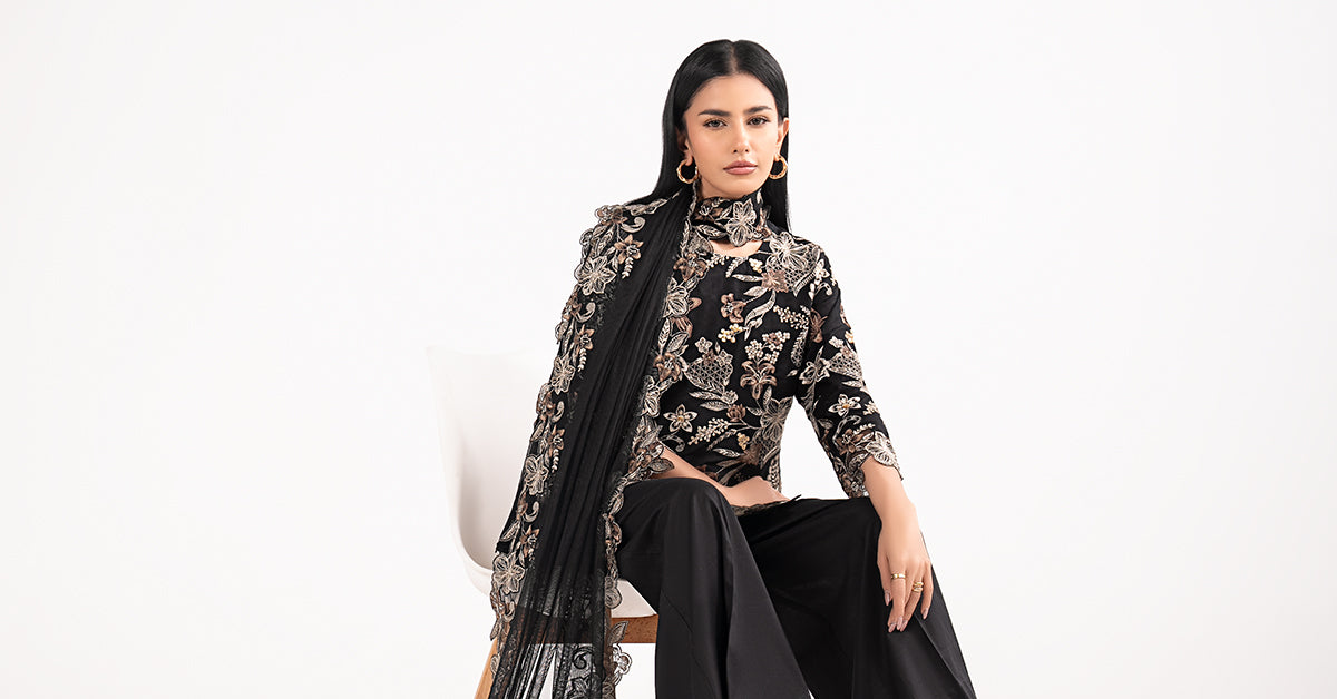 ShirtEmbroidered Straight ShirtRound NecklineEmbroidered SleevesColor: BlackFabric: Dobby LawnTrouserSolid CulottesElasticated WaistbandColor: BlackFabric: CambricDupattaSolid DupattaTwo-Sided Embroidered BorderTwo-Sided Lace BorderColor: BlackFabric: NetModel is wearing xs sizeNote: Dry Clean Only