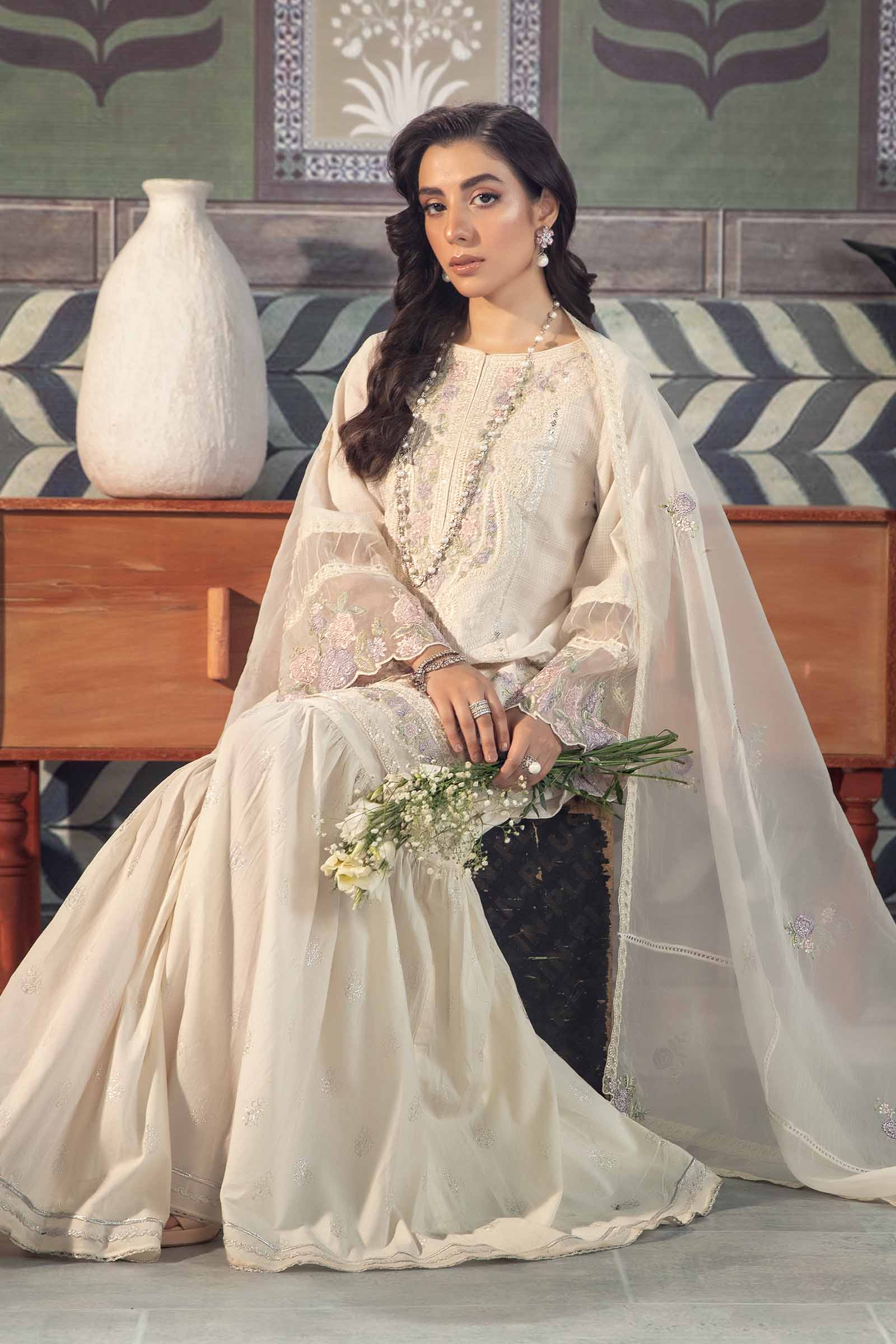 ShirtPanel Straight-Cut ShirtEmbroidered Boat NecklineDyed Front With EmbroideryOrganza Embroidered BorderFull Sleeves With Organza Embroidered BorderDyed BackFit: RegularColor: Off WhiteFabric: Cotton DoriaGhararaDyed Gharara With Screen PrintElasticated WaistbandGotta Patti Lace On HemFit: RelaxedColor: Off WhiteFabric: CambricDupatta Dyed Dupatta With EmbroideryColor: Off WhiteFabric: OrganzaWork Details: Sequins, Thread Embroidery & Panni WorkModel is wearing XS sizeNote: Dry Clean Only