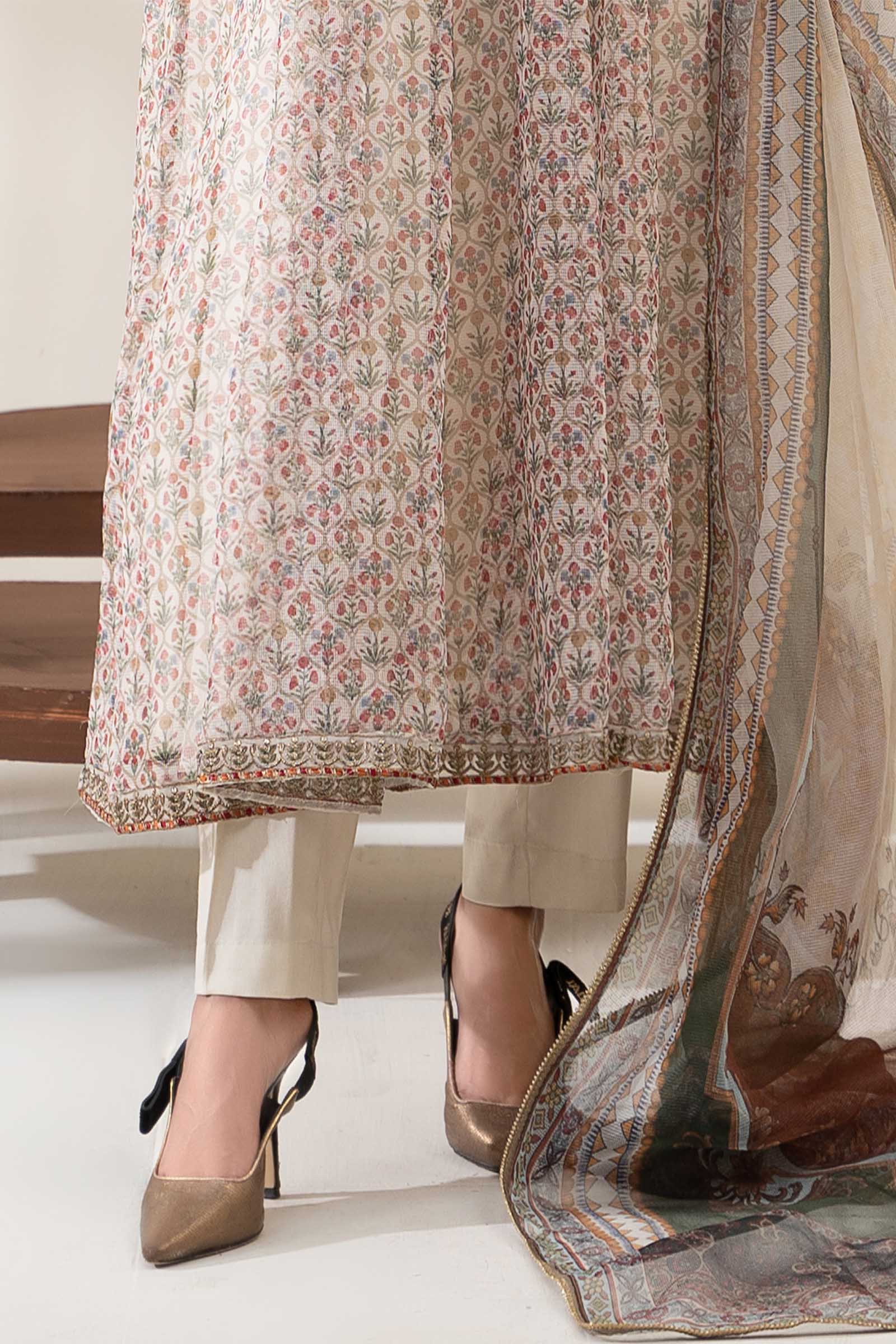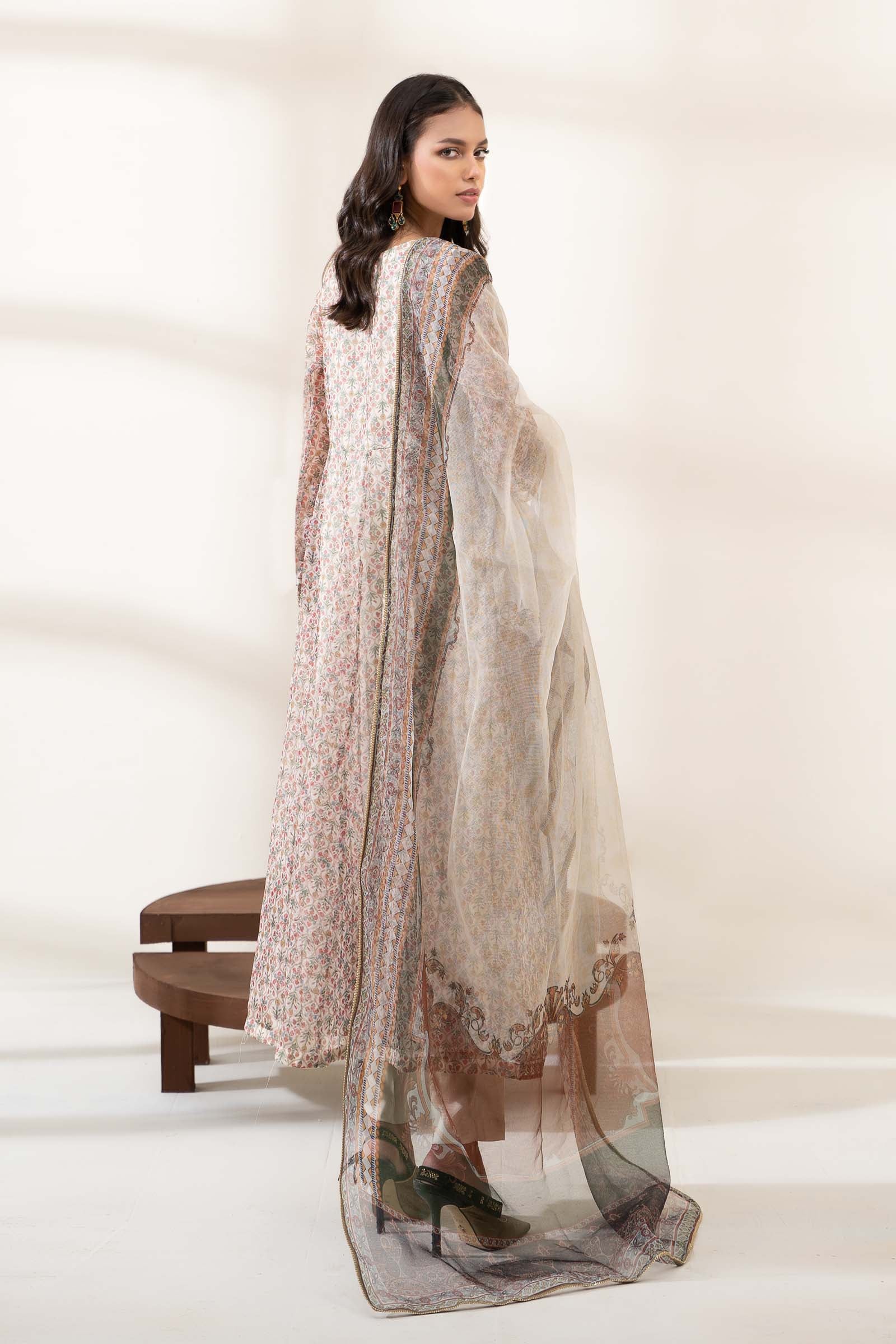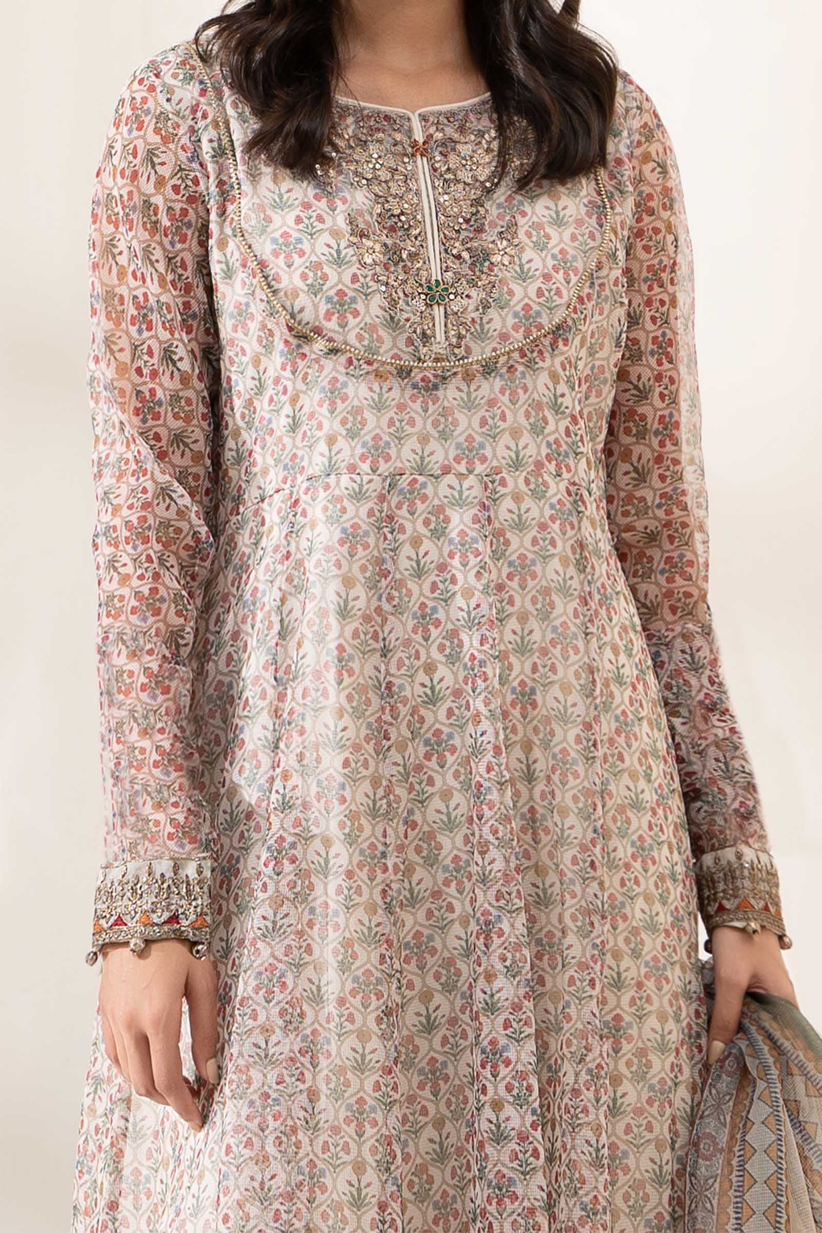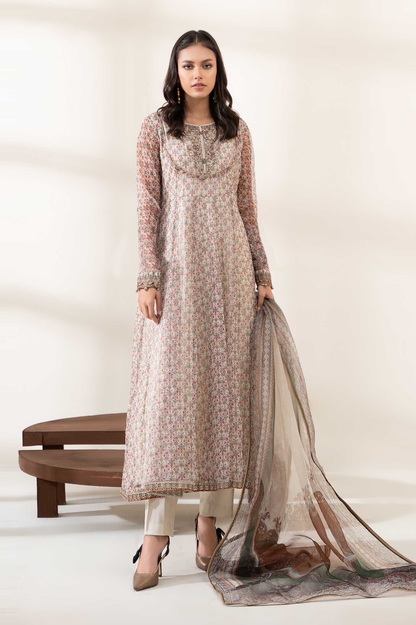 3 PieceShirt fabric: Net OrganzaTrouser fabric: CambricDupatta fabric: Net OrganzaLong frock with panels, Embroidered neckline and sleeves, Embroidered ghera border, Along with printed dupatta straight trouser.