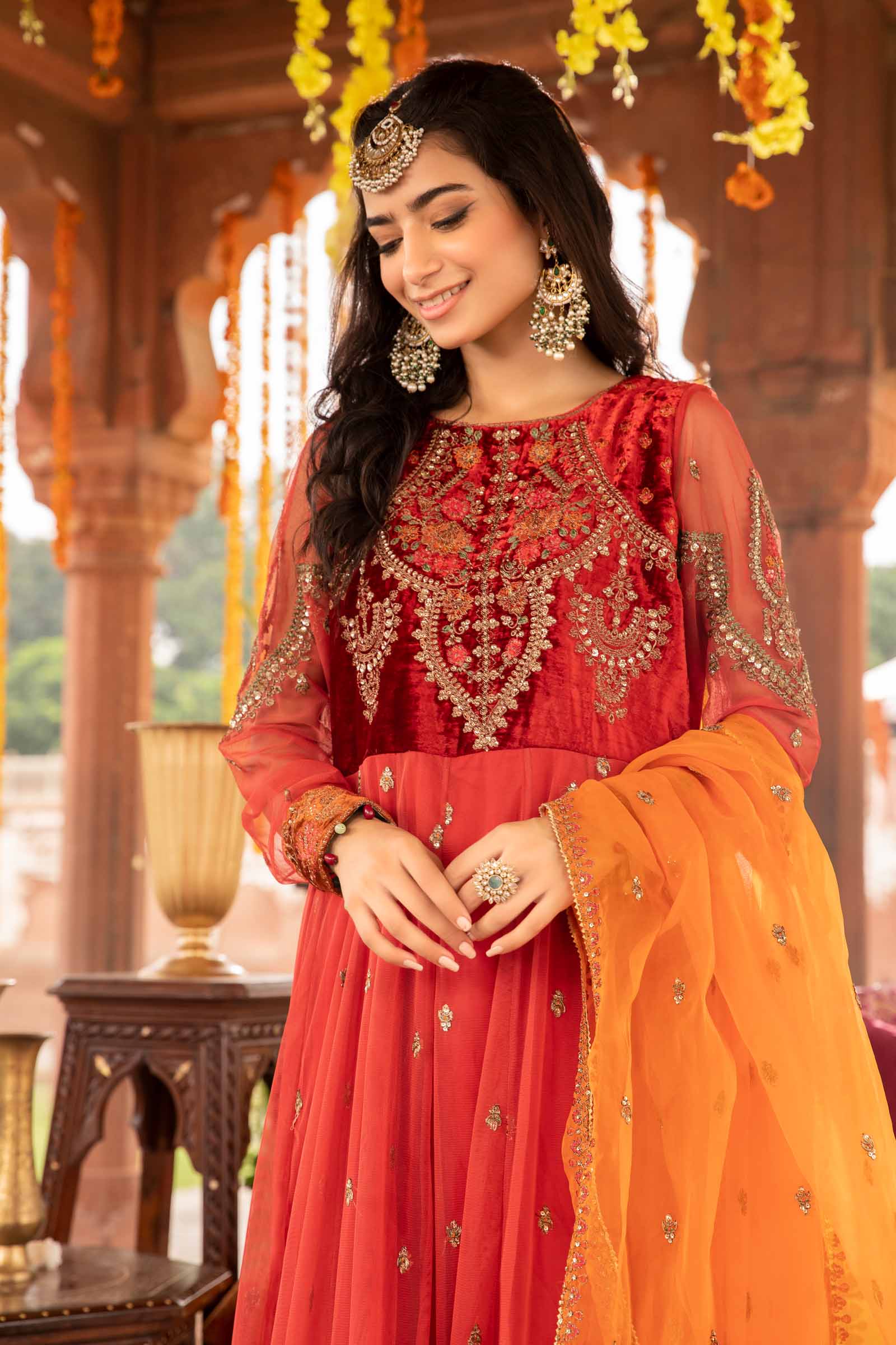 3 PieceFrock fabric: NetYoke fabric: VelvetTrouser fabric: CambricDupatta fabric: OrganzaLong frock with embroidered bodice, Embroidered border on sleeves, Embroidered dupatta along with straight trouser