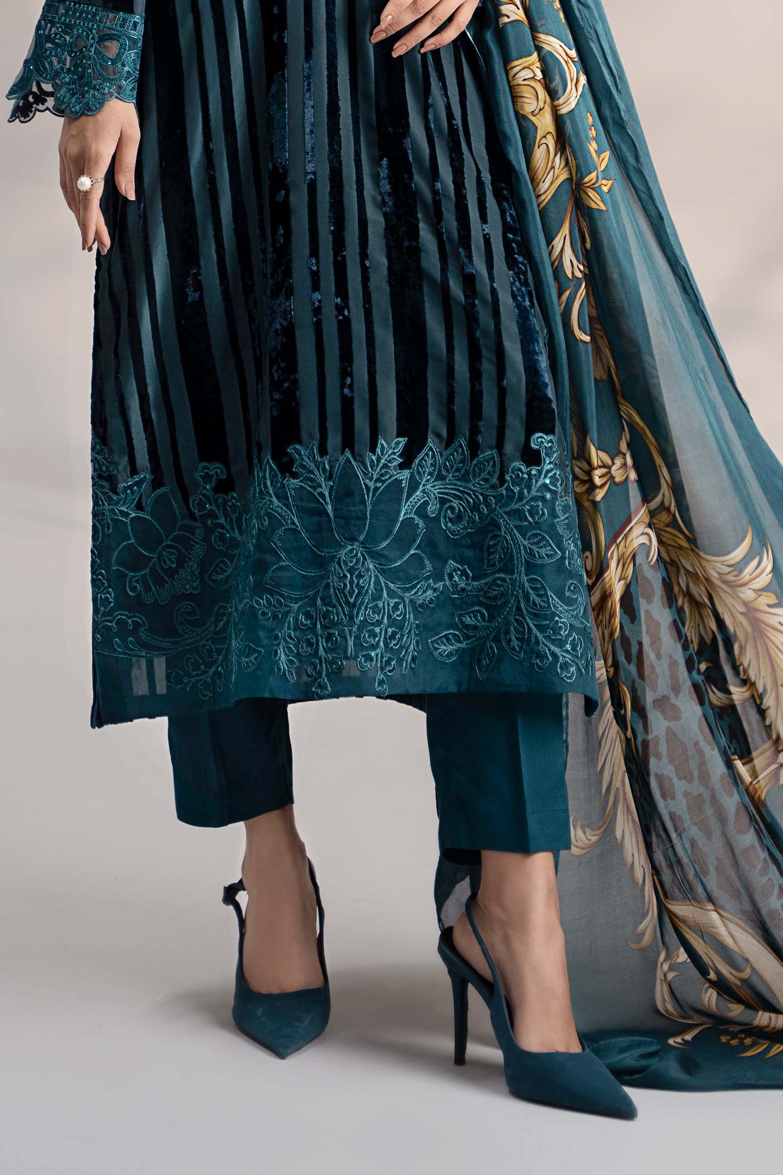 ShirtEmbroidered Overlap NecklineEmbroidered Border Wih Pearl DetailingFull Sleeves With Embroidered BorderFit: RegularColor: TealFabric: PlushUndershirtDyed Sleeveless UndershirtFit: RegularColor: TealFabric: LinenTrousersDyed Straight Fit TrousersElasticated WaistbandFit: RegularColor: TealFabric: LinenDupatta Digital Printed DupattaColor: BlackFabric: Medium SilkWork Details: Sequins & Thread Embroidery With Pearls DetailingModel is wearing XS sizeNote: Dry Clean Only