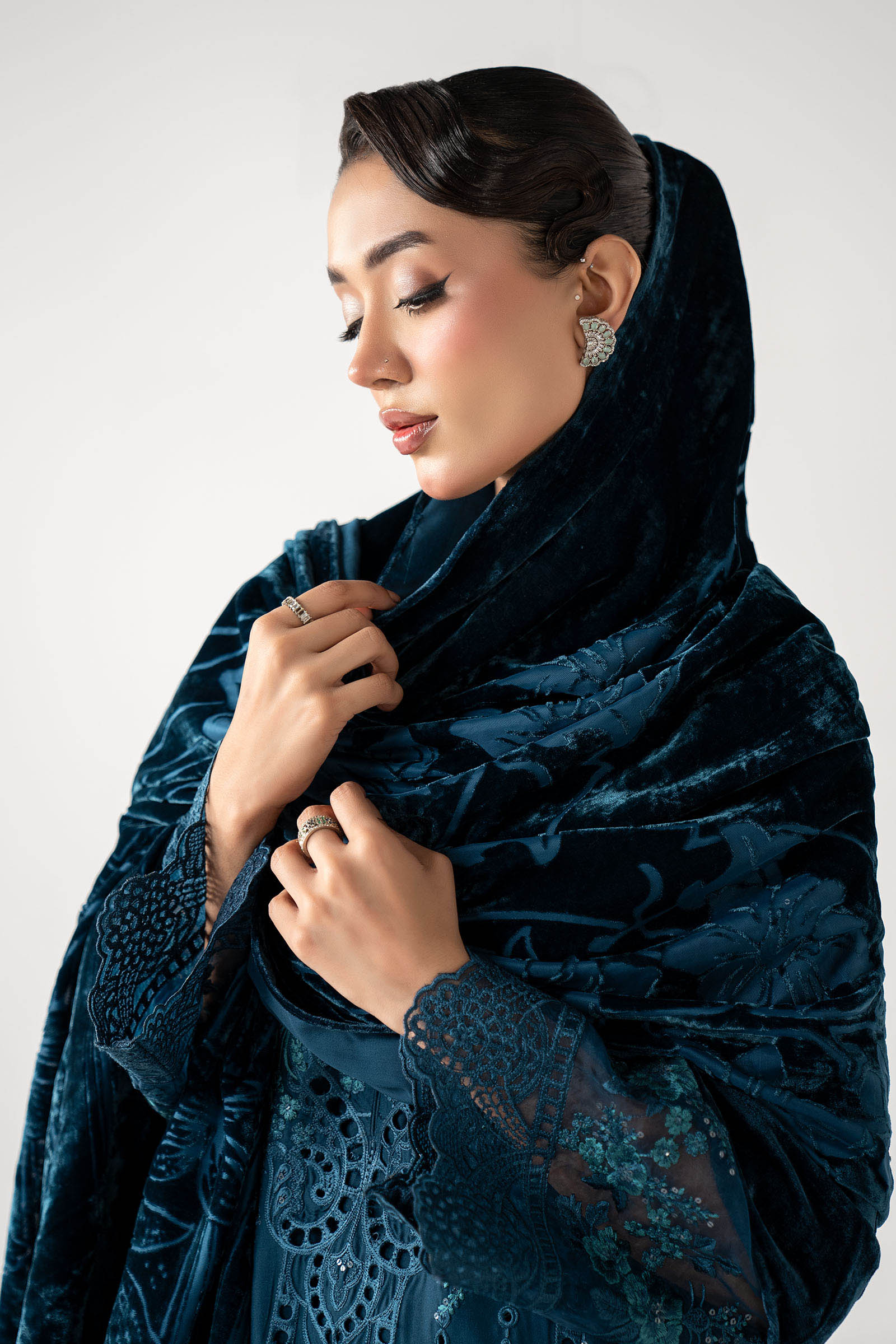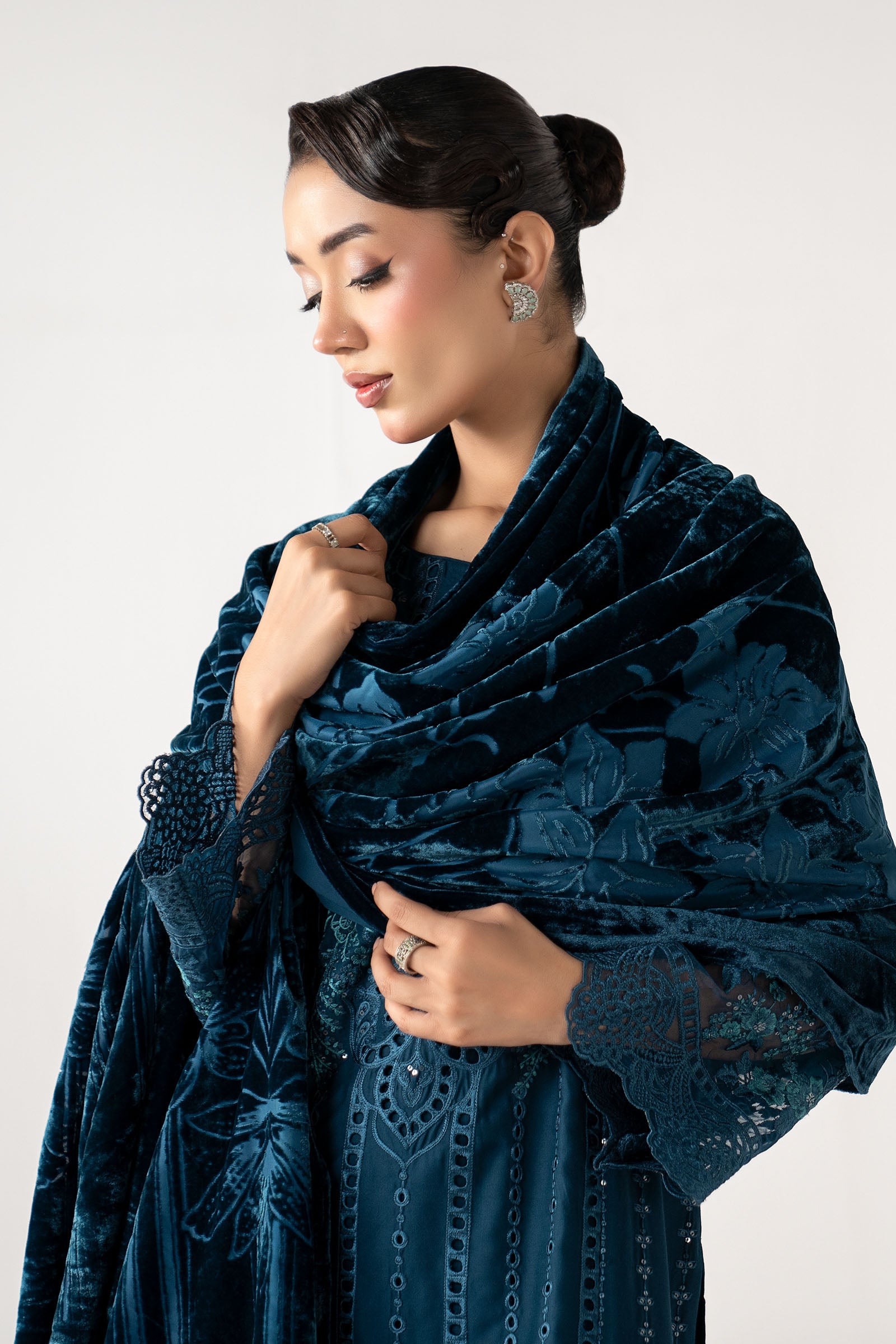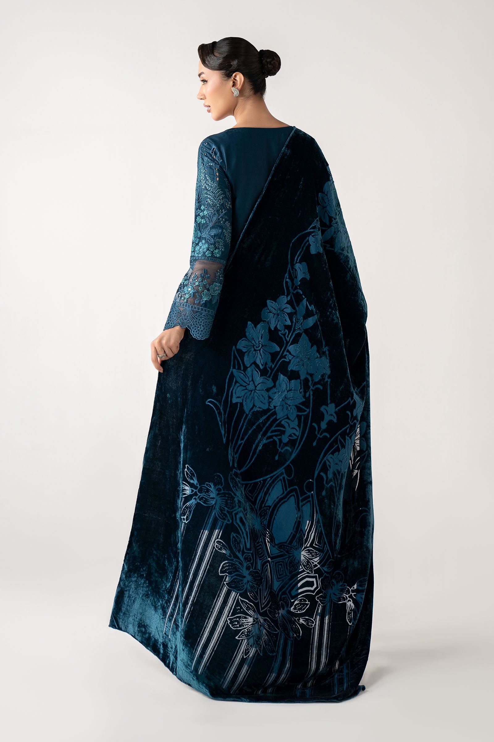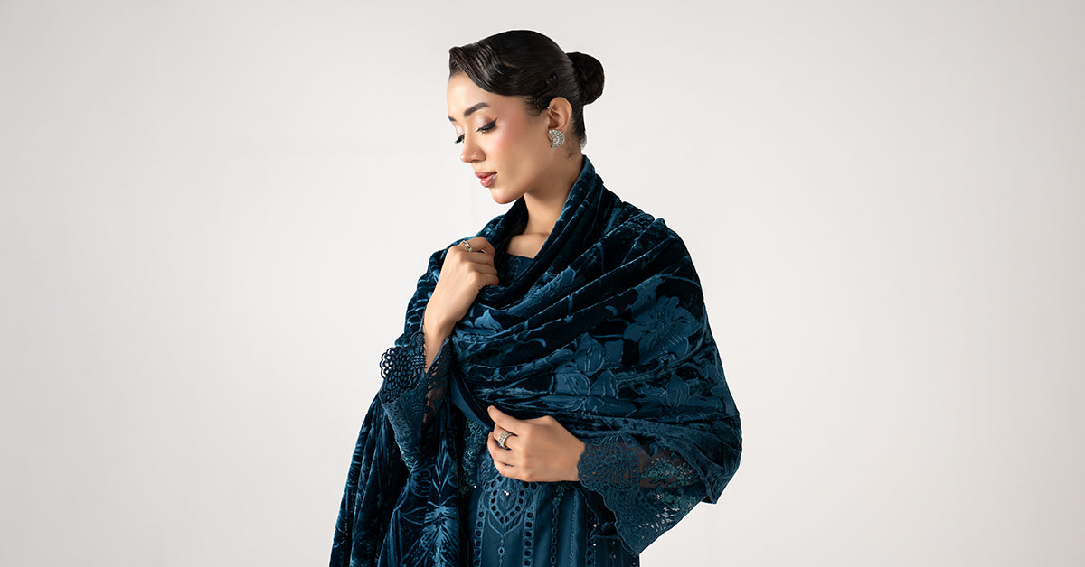 ShirtStraight-Cut ShirtRound Neckline With Buttons DetailingBoring Embroidered Center PanelEmbroidered Side PanelSchiffli Embroidered Organza Scalloped Border IEmbroidered Organza Border IIBoring Embroidered Sleeves With Embroidered Organza BorderDyed BackFit: RegularColor: TealFabric: LinenTrouserDyed Straight TrouserElasticated WaistbandFit: RegularColor: TealFabric: LinenShawlDyed ShawlColor: TealFabric: PalachiWork Details: Sequins & Thread Embroidery Model is wearing xs sizeNote: Dry Clean Only