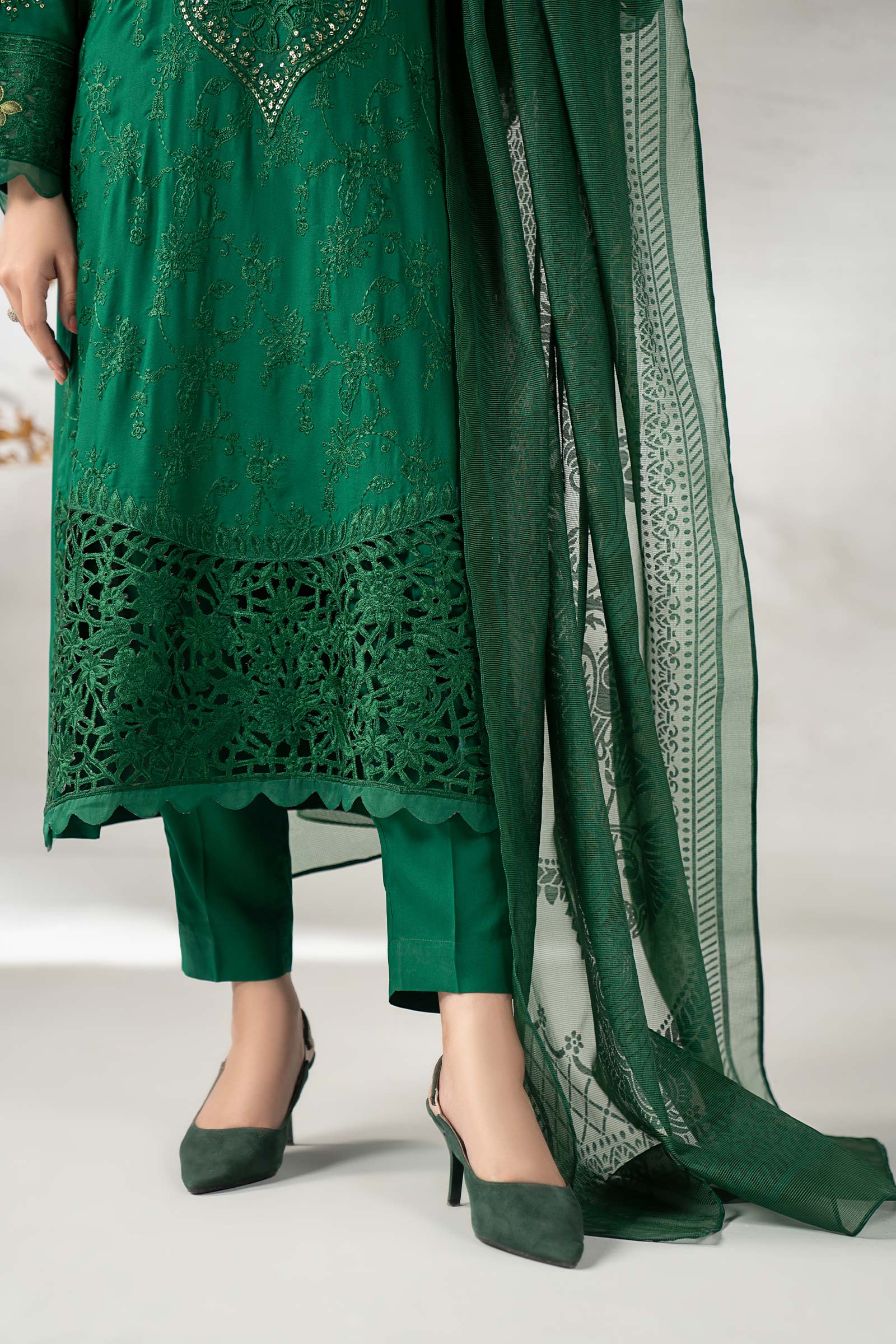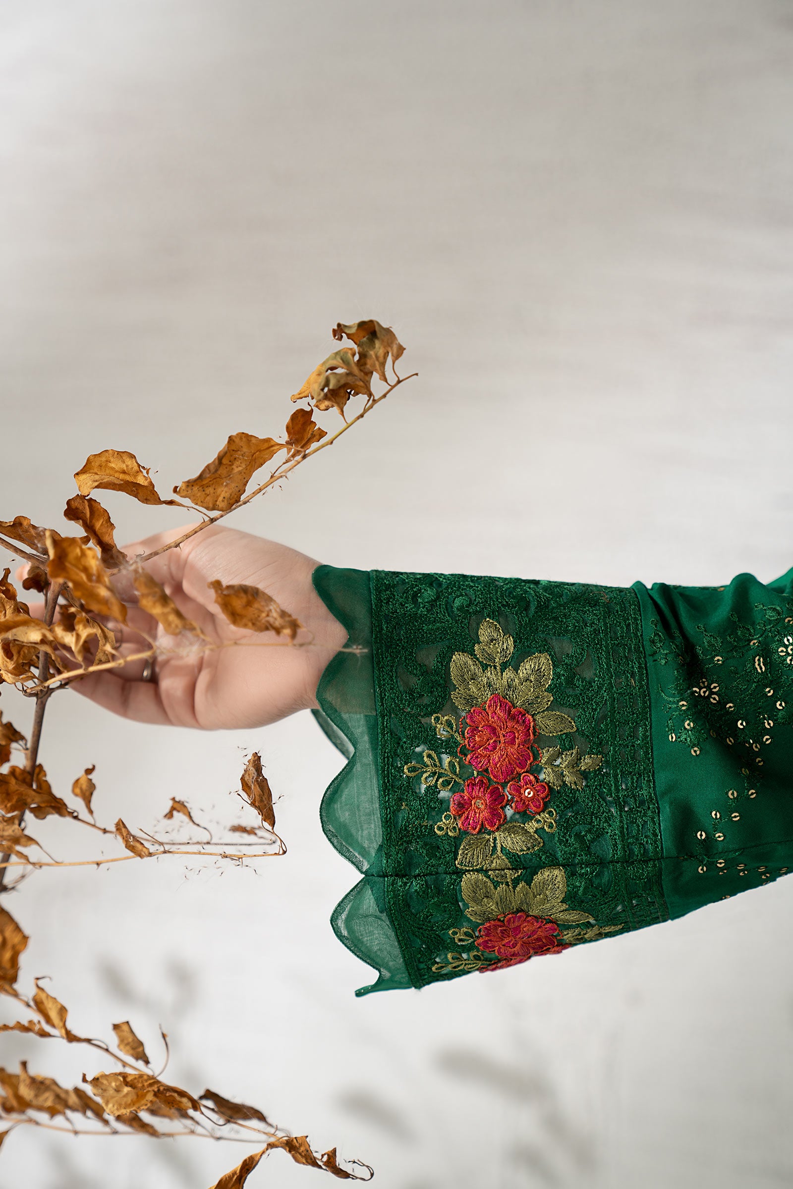ShirtStraight-Cut ShirtHand-Embellished Kashmiri NecklineDyed Front With EmbroideryKavya Embroidered Organza BorderEmbroidered SleevesScalloped Organza Detailing On Sleeves & BorderDyed BackFit: RegularColor: GreenFabric: LinenTrouserDyed Straight TrouserElasticated WaistbandFit: RegularColor: GreenFabric: LinenDupattaBurnout DupattaColor: GreenFabric: Rajo NetWork Details: Sequins & Thread EmbroideryModel is wearing xs sizeNote: Dry Clean Only