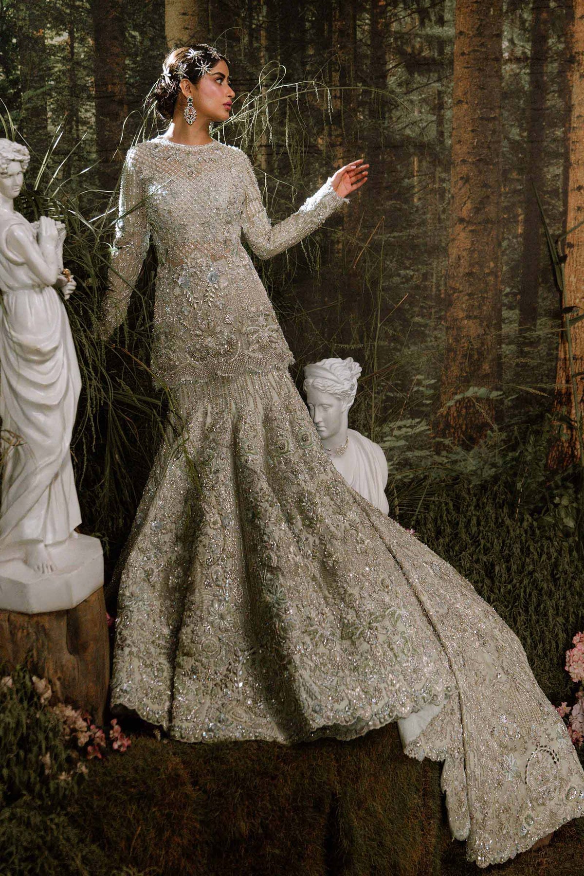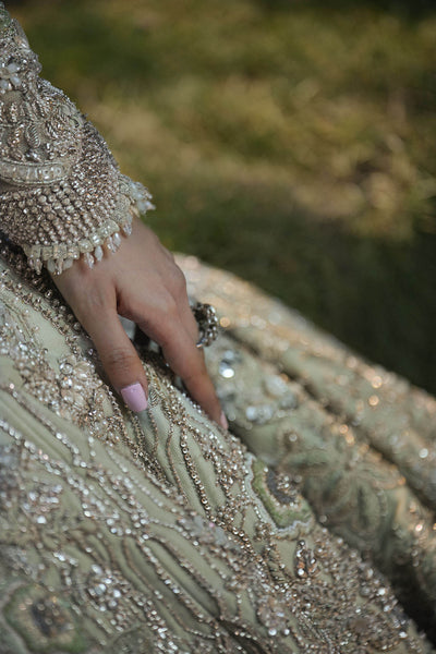 A masterpiece of bridal opulence, this mermaid Lehenga Set embodies the splendor of a royal muse. Crafted with strings of pearls and mirrors that shimmer like liquid light, it is adorned with sequins, aqua fringes, colored threadwork, and crystal embellishments, each detail a testament to timeless artistry. The dupatta, edged with scalloped borders and crystal-sprayed motifs, flows in satin-finished elegance. Designed for her grand day with delicate embellishments of glistening sequins parls, it captures the essence of regal romance and the grace of a bride destined to reign in beauty.