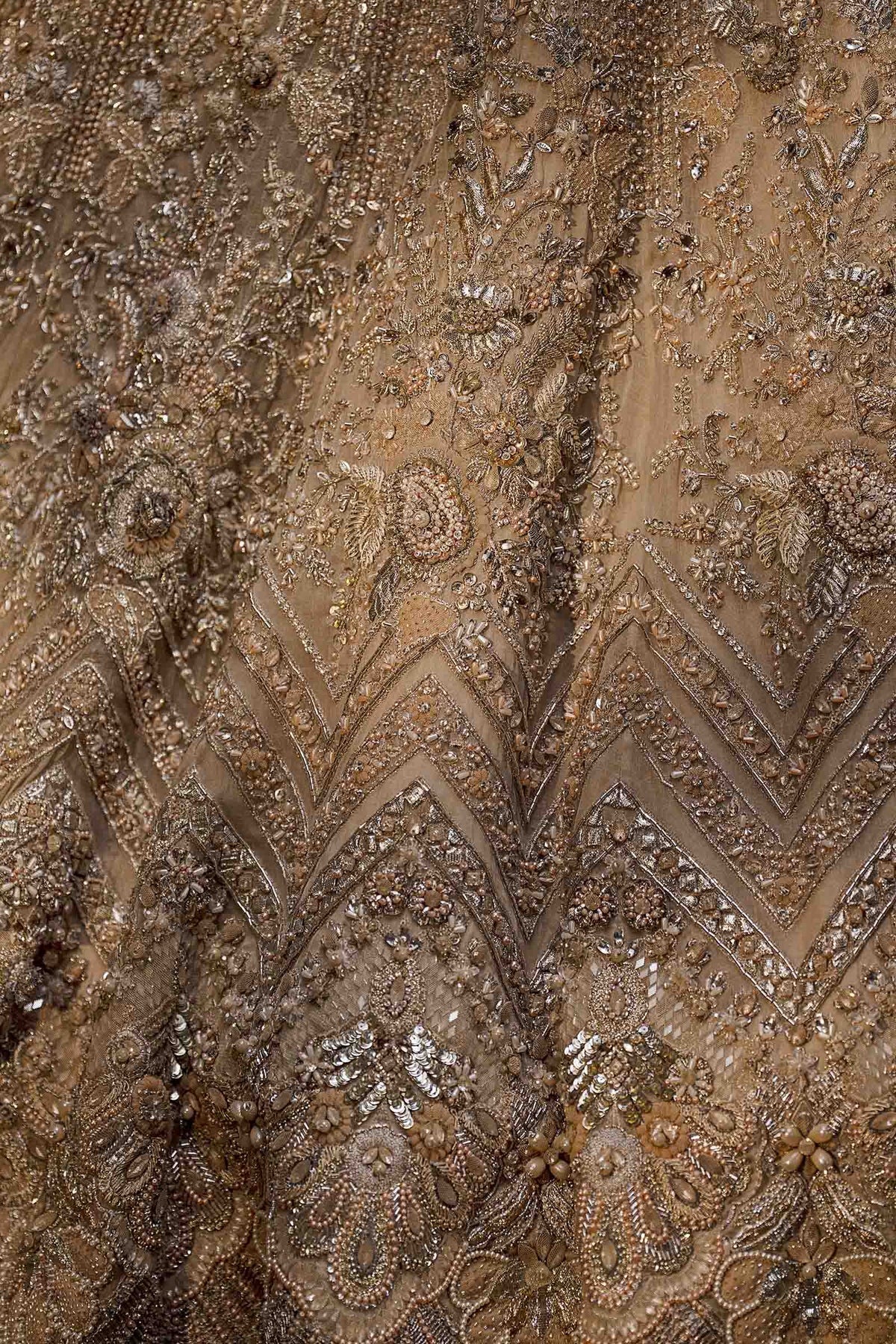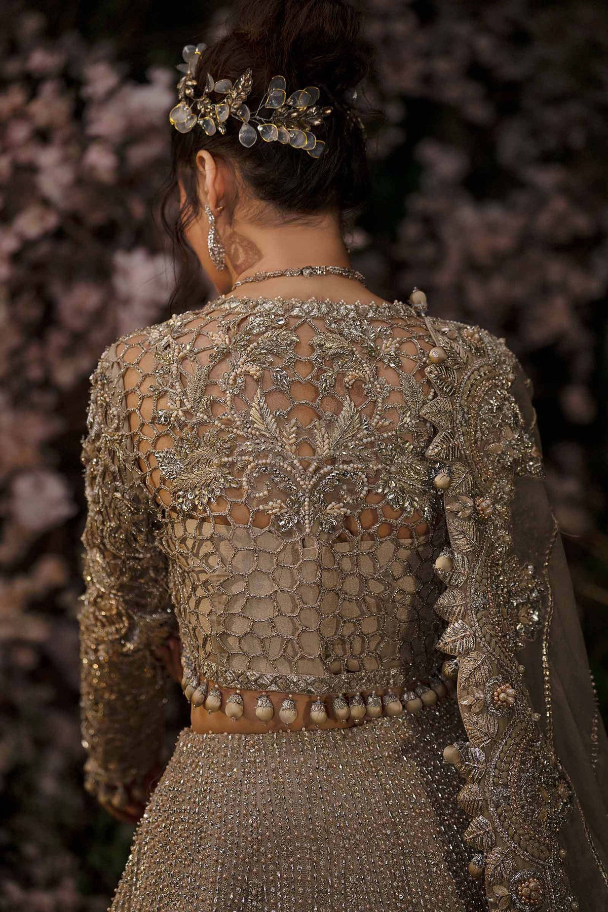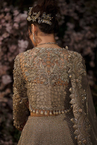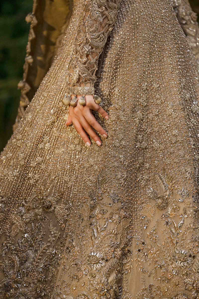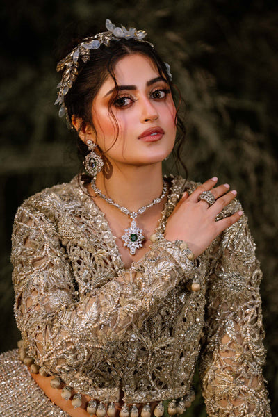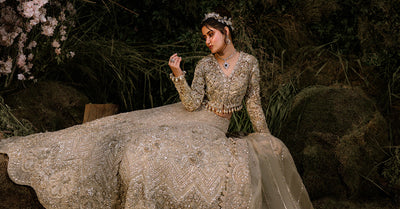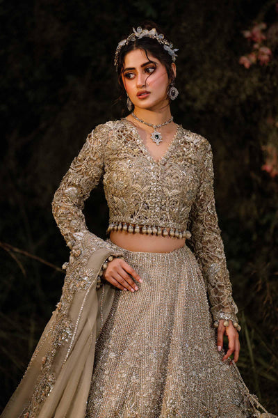 A timeless radiance in this ethereal gold /ivory Lehenga Set, a canvas where craft and couture entwine. Sculpted with 3D florals that bloom in light, kissed by pearls and glimmering gotta, it glows with an understated opulence. The intricate play of dabka, nakshi, and diamanté embroidery evokes timeless artistry, making it a masterpiece for the bride who dreams in elegance, yet moves through modernity with grace.