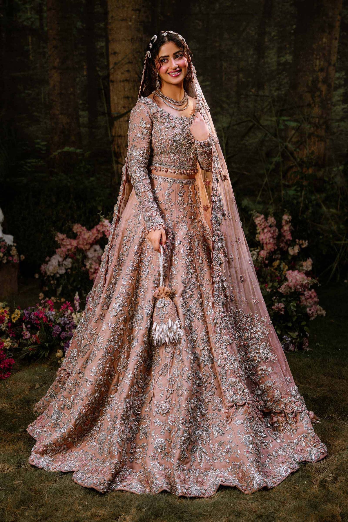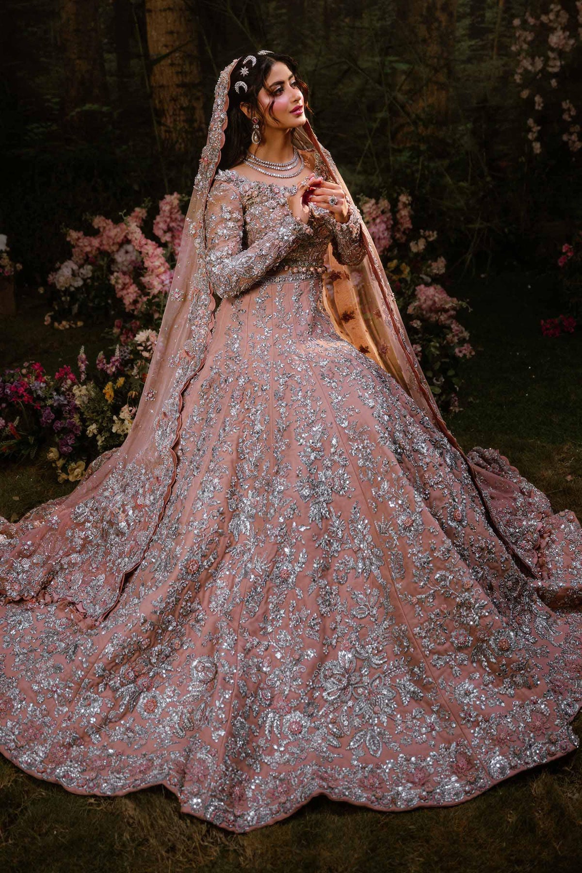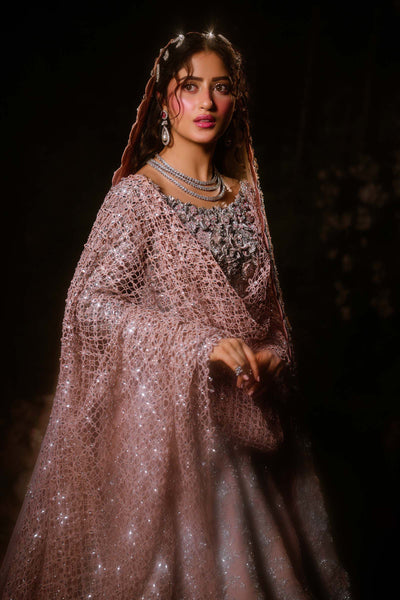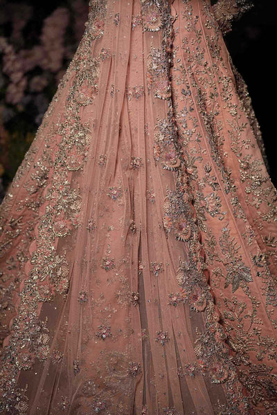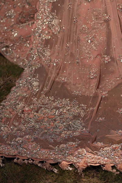 A vision of timeless grace, this powder-peach Lehenga Set captures the essence of modern romance steeped in tradition. Adorned with intricate 3D gotta work, pearls, and exquisite dabka-nakshi embellishments, it radiates soft luminosity and regal charm. The ensemble is completed with a delicately crafted schiffli-embroidered dupatta (optional), dusted with diamanté accents that shimmer like whispers of light, adding extra ethereal touch to the bride who embodies both classic allure and contemporary poise.