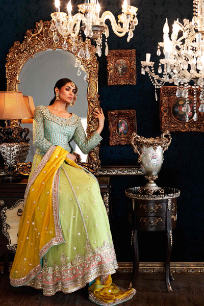 Restoring the heritage craft of dabka & naqshi embroidery with our Ziv Lehenga Set. Designed in a vivid palette, this remarkable piece looks dreamy and ethereal with gleaming details of sequins & beads, making it perfect for Mehndi celebrations.