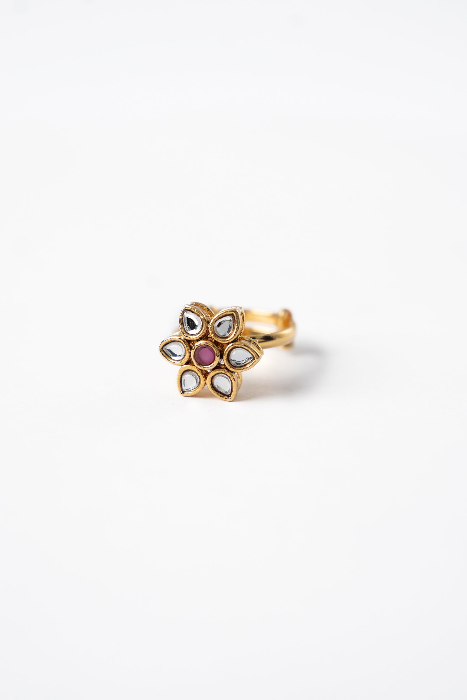 Adorn our traditional Gehna Bridal Set, featuring handcut glass stone artisanship finished with glistening pink chatham and white zircons. The set includes a majestic necklace, a pair of earrings, and a ring that make your big day special.Finish: 21K Gold PlatedBack Pin: Sterling Silver StudRing Size: AdjustableProduct Care: Wipe Clean