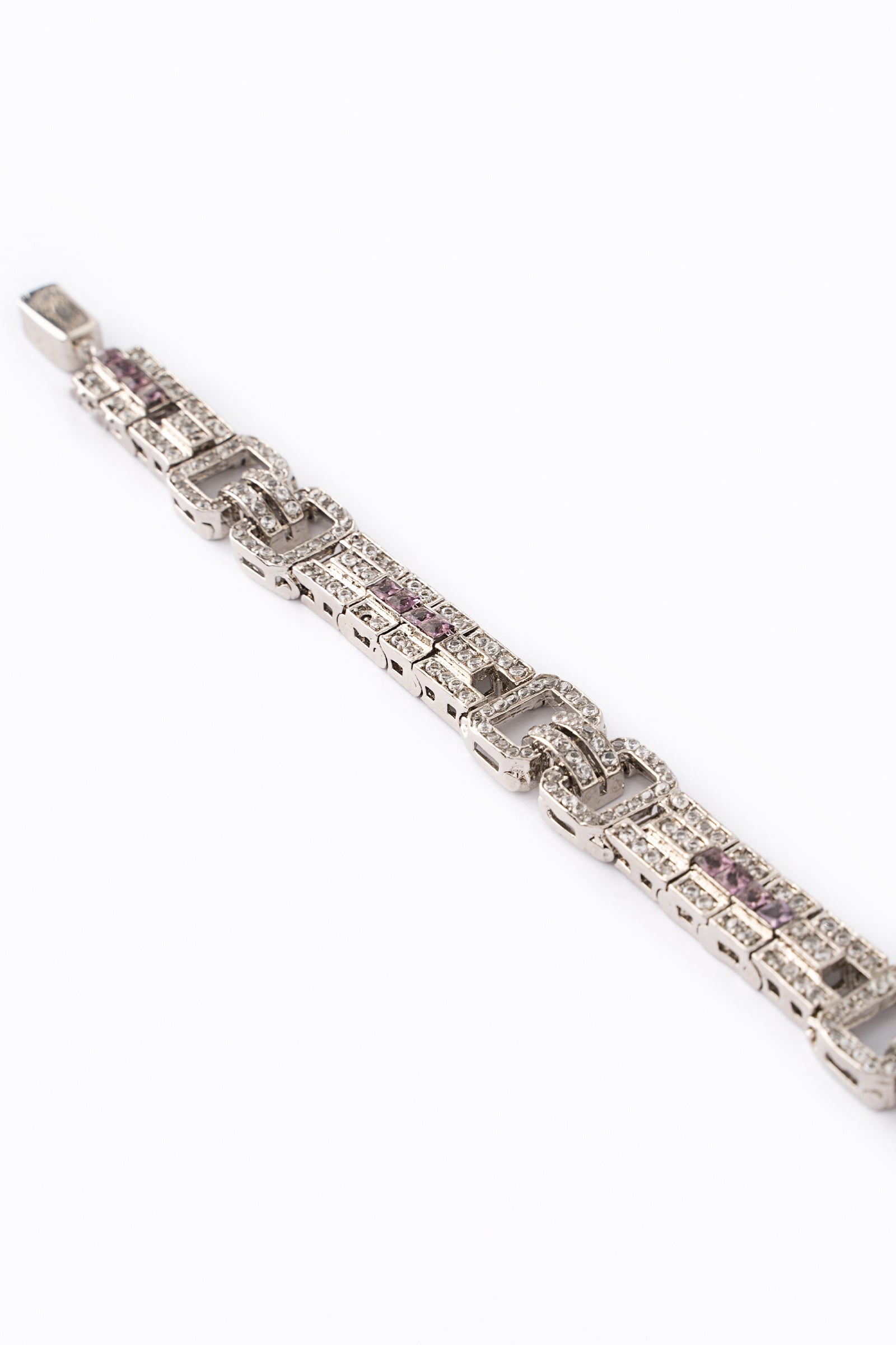 Make a lasting impression by accessorizing your look with our Idhal Bracelet. Featuring white zircons artistry studded with light amethyst. This masterpiece is perfect to effortlessly steal all attention. Style it with your casual wear or festive look. Finish: Silver Lock: Box Clasp Product Care: Wipe Clean