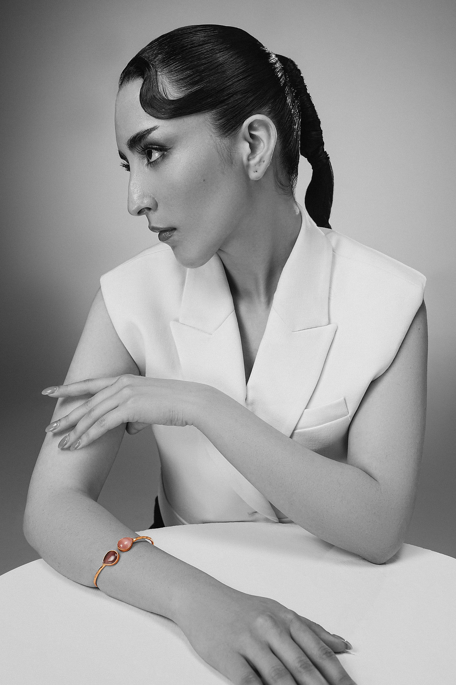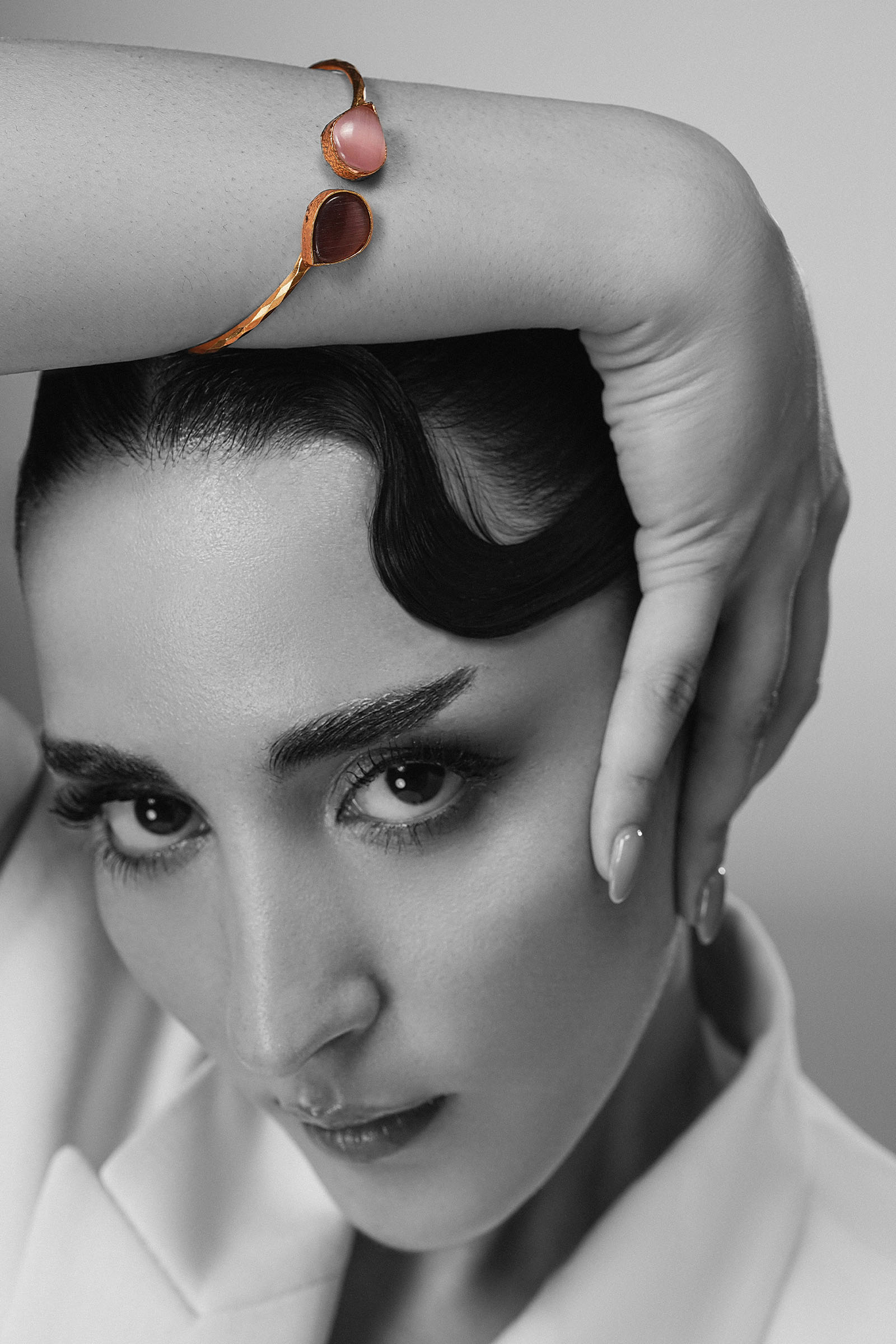 A delicate verse in metal and stone, our Tansu Bracelet cradles luminous mint-green and purple cat’s eyes within a fluid, handcrafted twisted metal frame. Each curve radiates quiet luxury and timeless charm, making every gesture a subtle ode to elegance. Composition: 21K Gold Plated Care Instructions: Wipe Clean