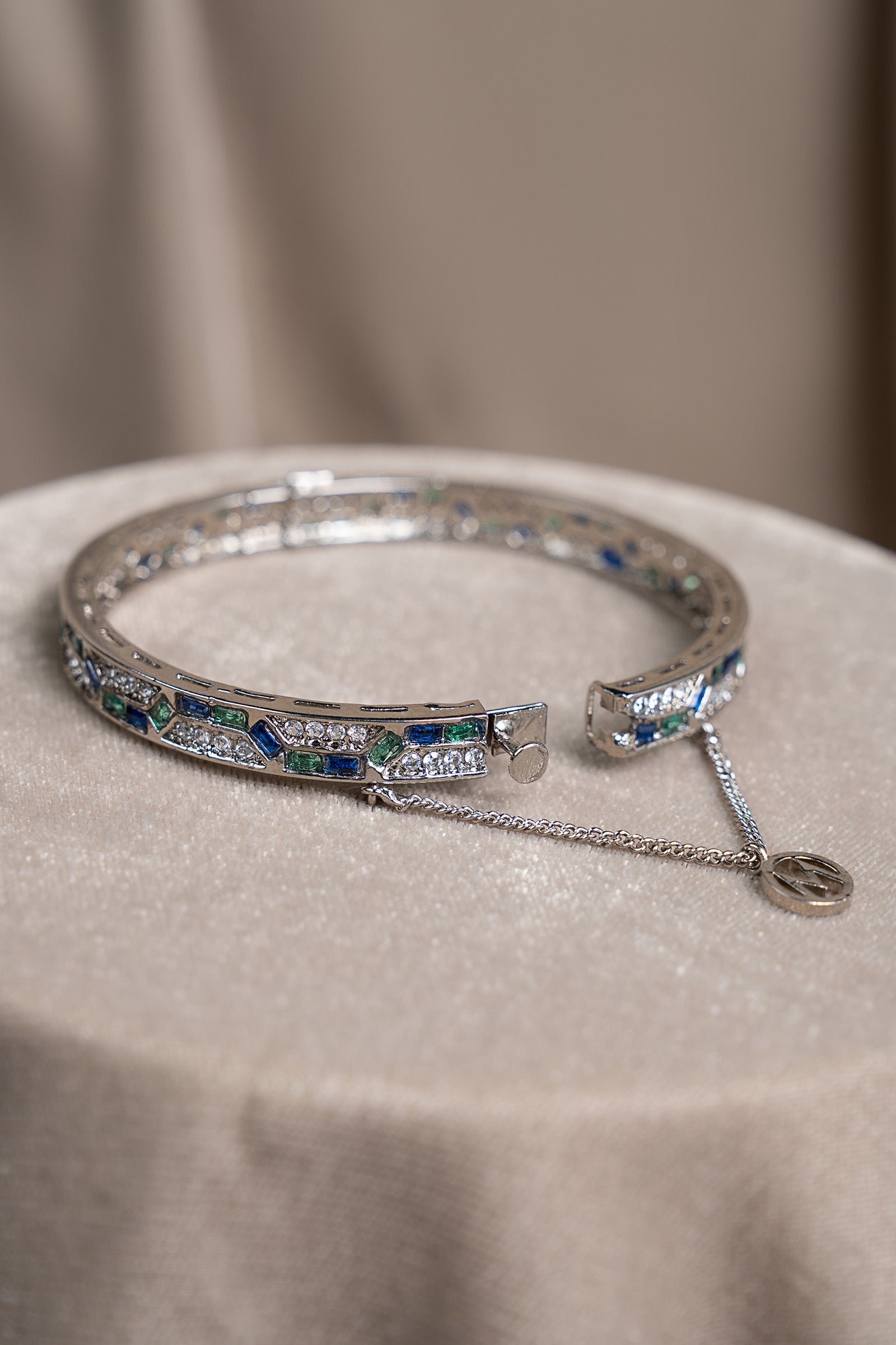 Bold and captivating, this churi shines with vibrant green emerald, blue sapphire and sparkling white zircons - an artistic fusion of modern edge, romantic charm, and timeless grandeur. Composition: Silver Lock: Box Lock Care Instructions: Wipe Clean