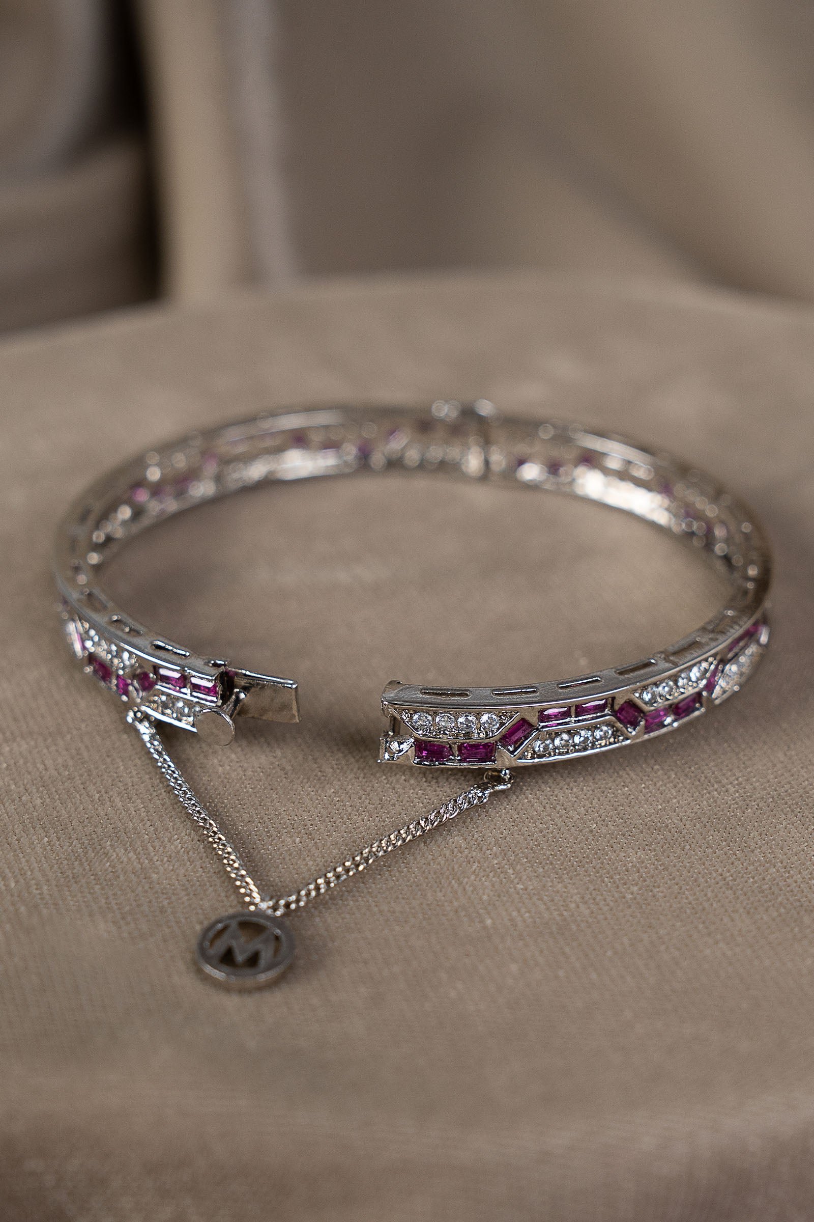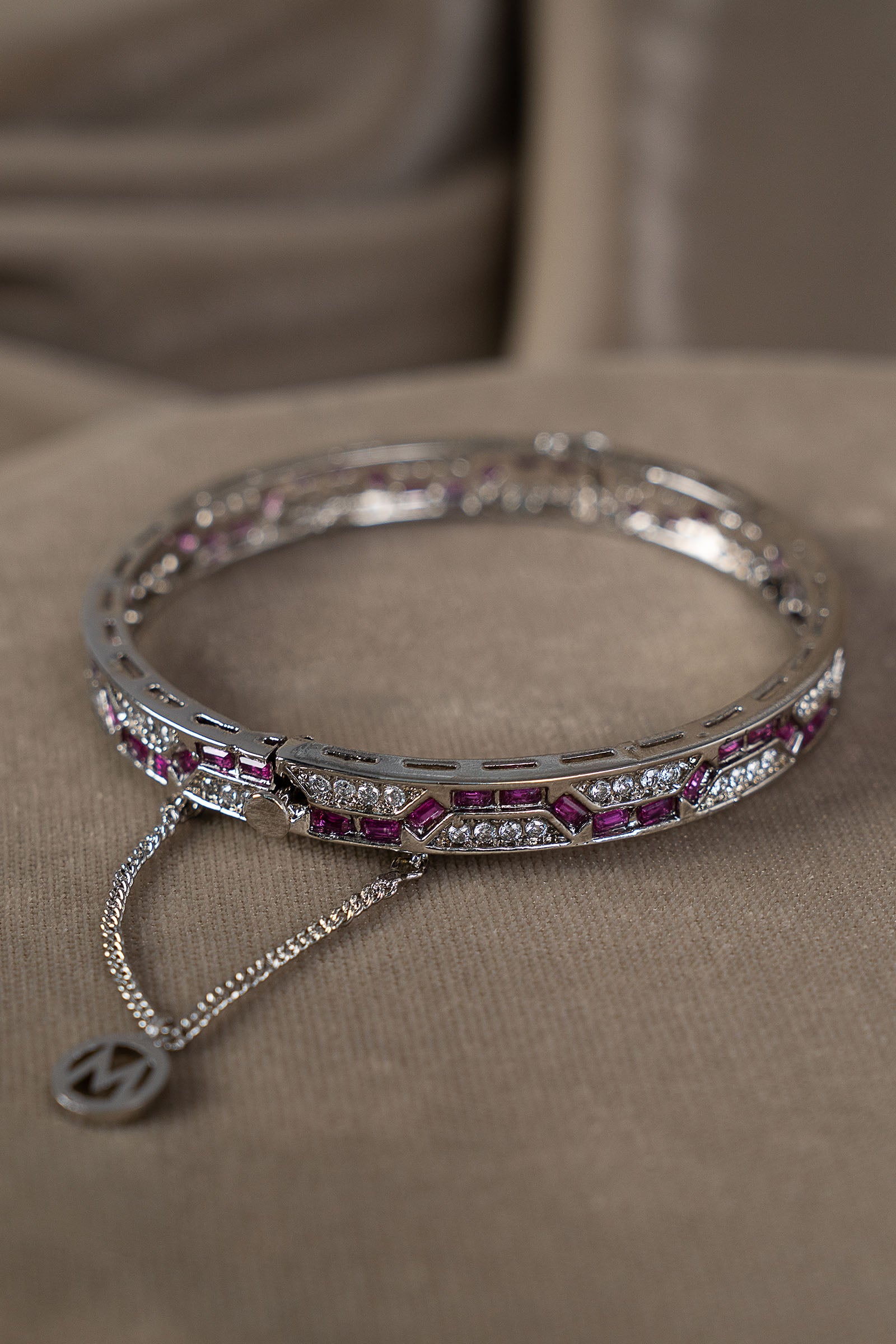 Bold and captivating, this churi shines with vibrant pink rhodolite and sparkling white zircon - an artistic fusion of modern edge, romantic charm, and timeless grandeur.