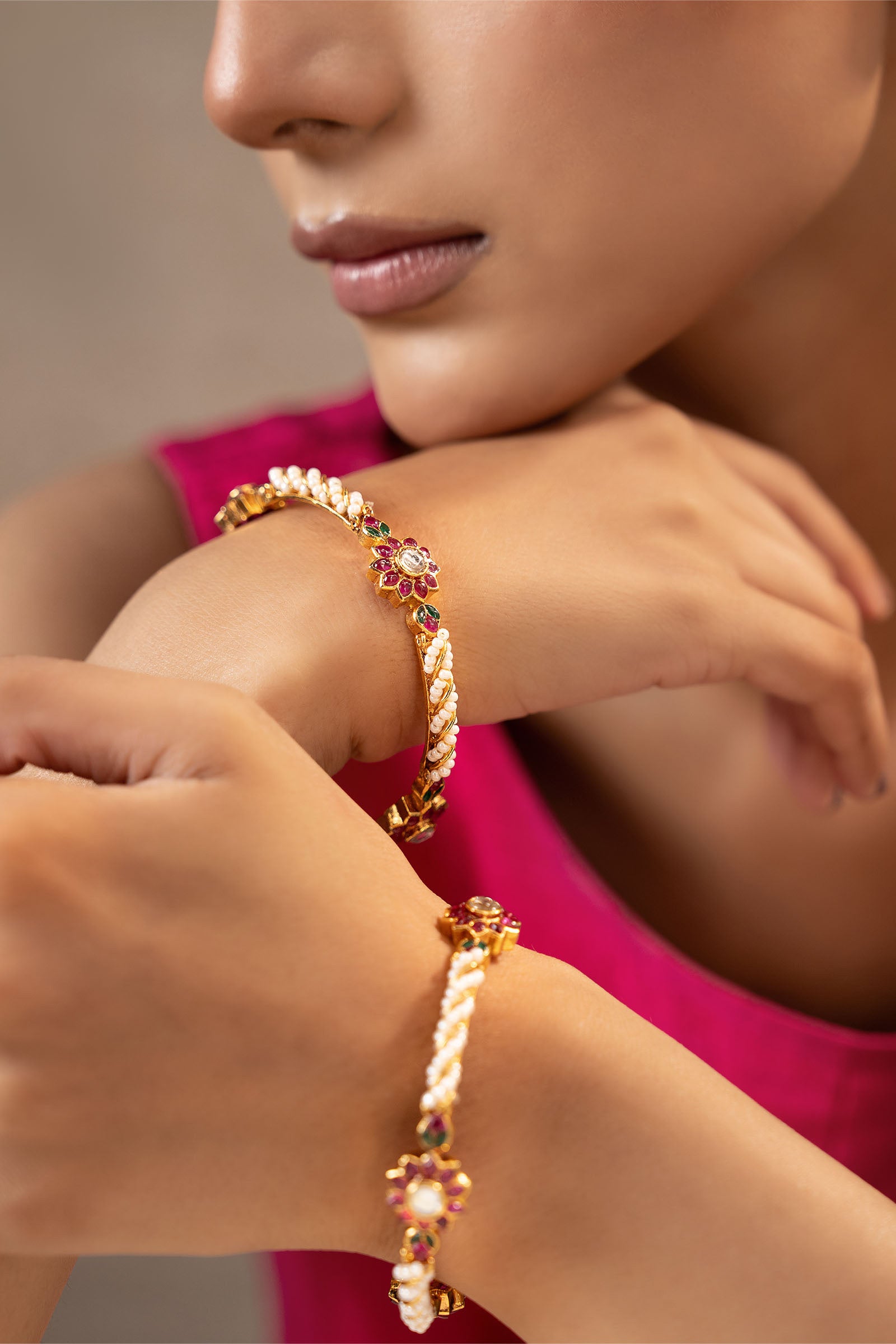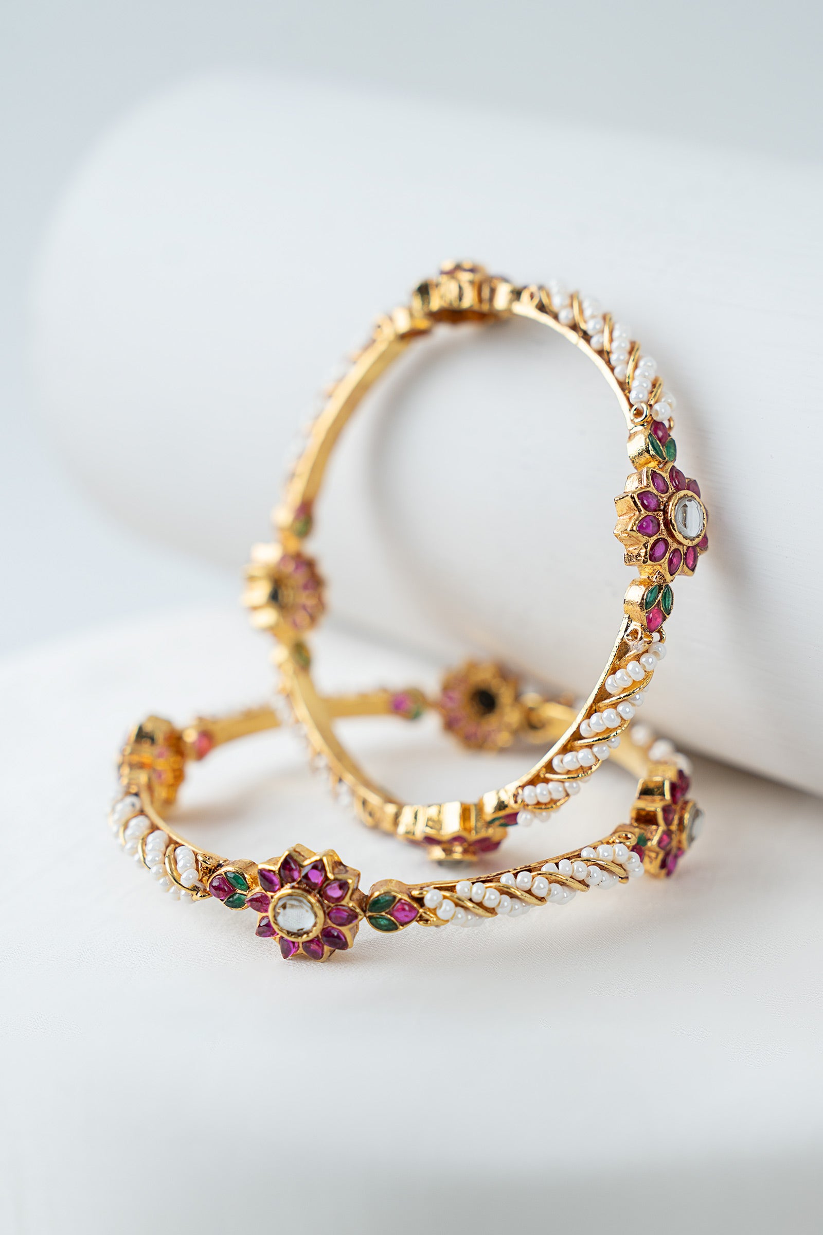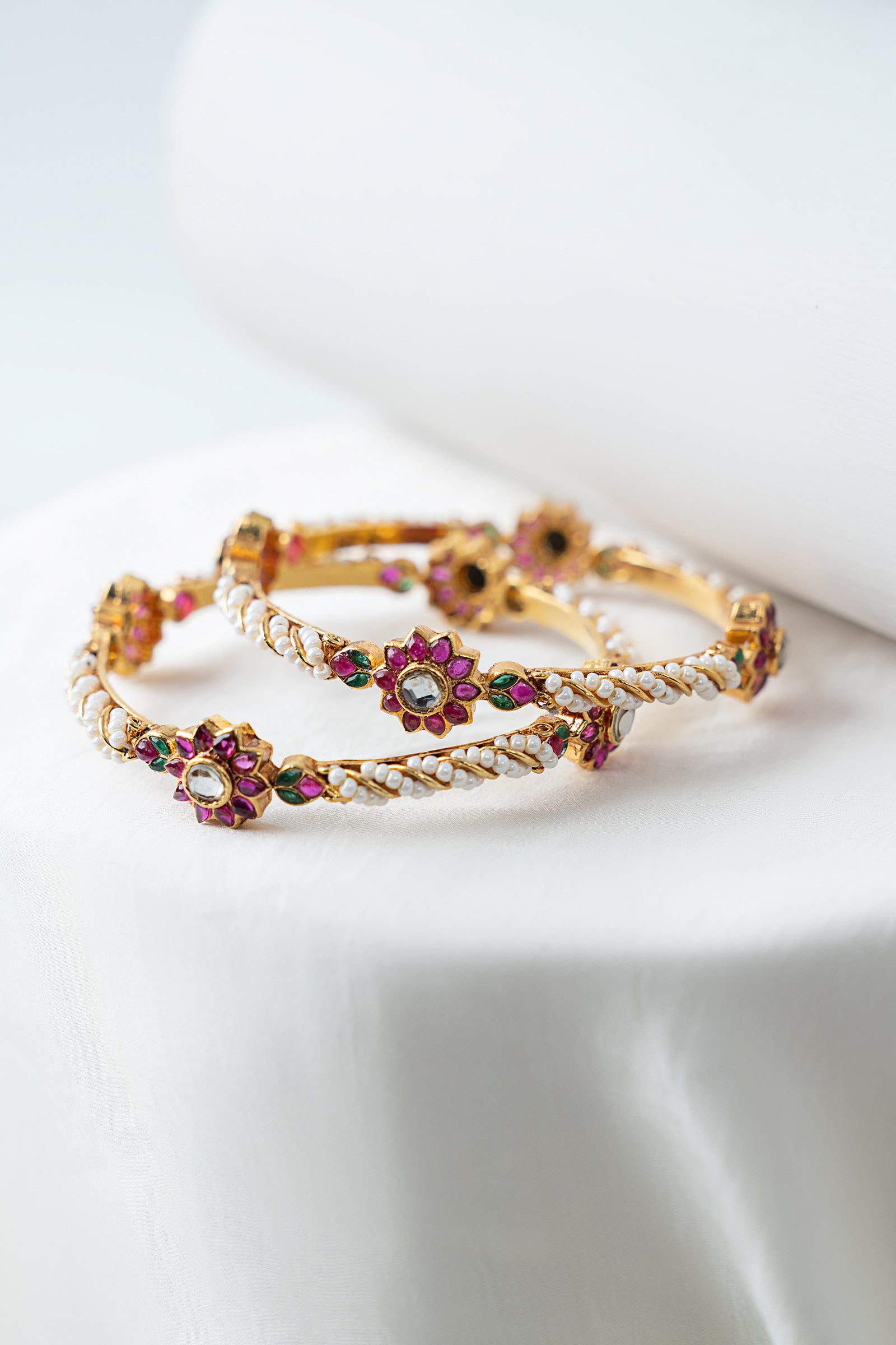 A timeless celebration of heritage, this handcrafted churi pair feature the richness of pink chatham stones in an artful amalgamation with white hand-cut glass and green onyx artistry — all brought together with traditional indian poth pyroi. An elegant fusion of color and culture, perfect for your festive look.Finish: 21K Gold PlatedProduct Care: Wipe Clean