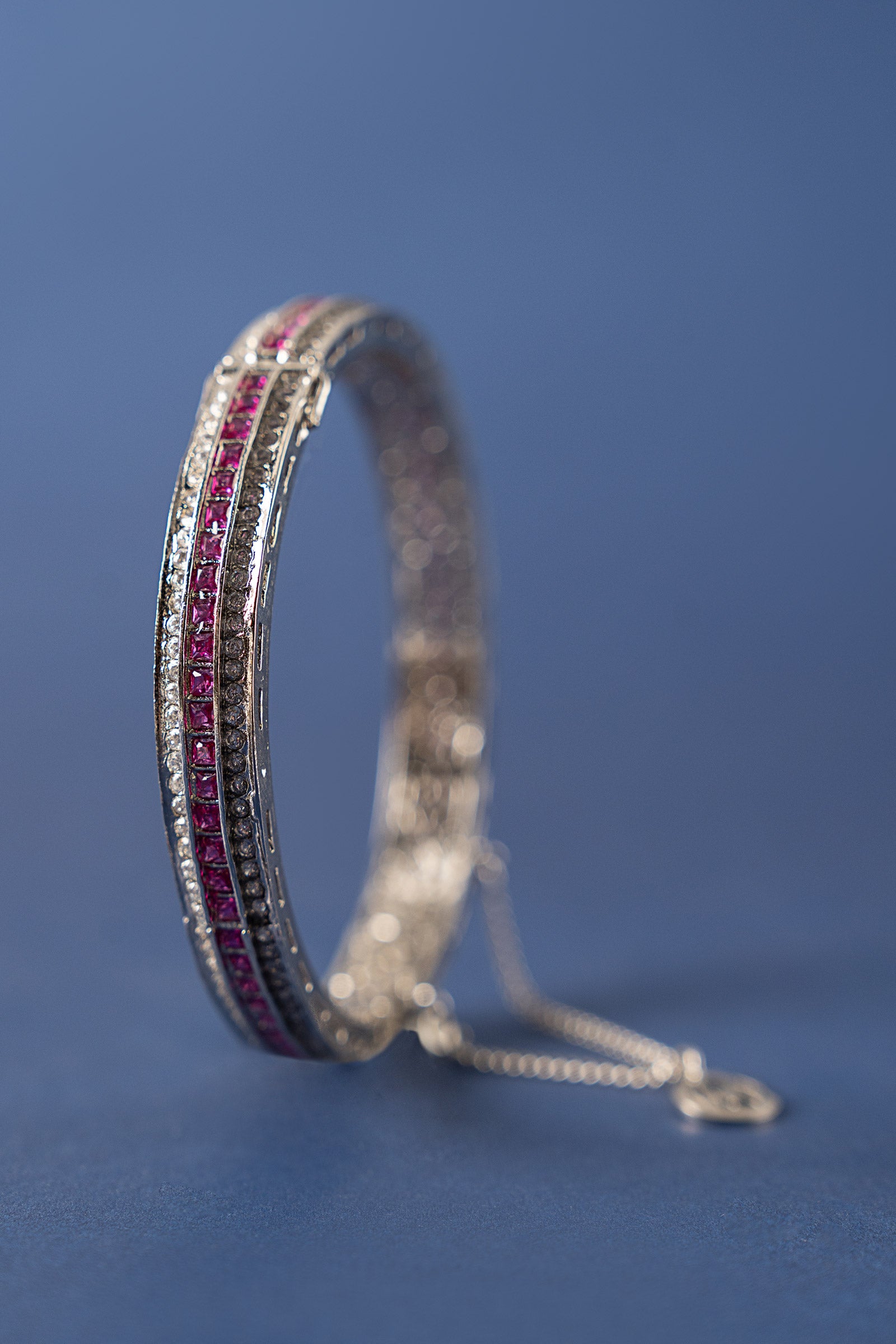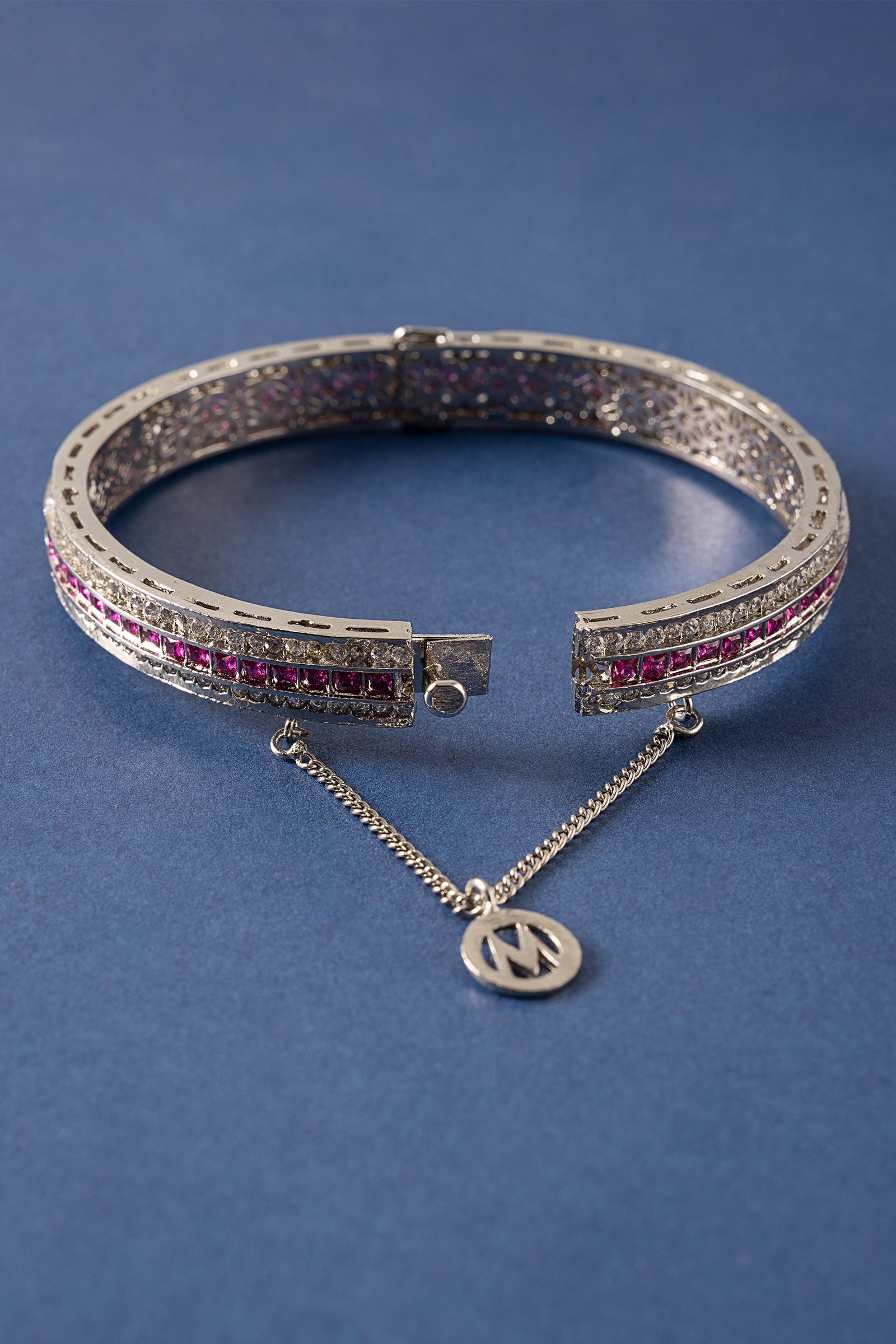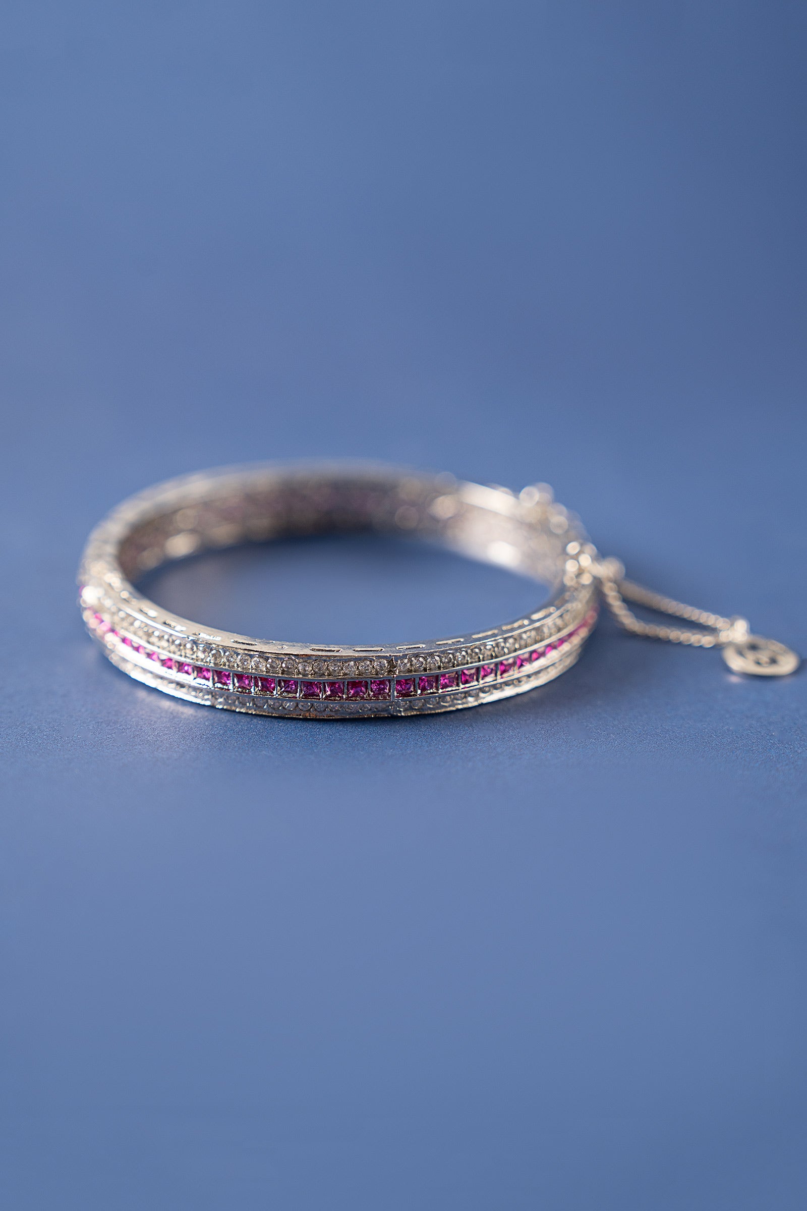 Bold meets beautiful in this statement churi, crafted with radiant pink rhodolite and sparkling white zircons. A contemporary twist on classic elegance, designed to turn heads at every celebration. Finish: Silver Lock: Box Lock Product Care: Wipe Clean