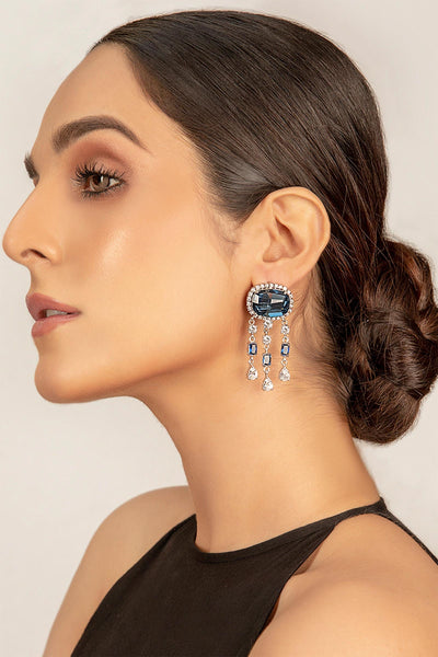 A palyful celebration of eveningwear with demin blue swarovski crystal, luxurious handset zircon in rhodium plating built with a delicate technique and keen sense of detail