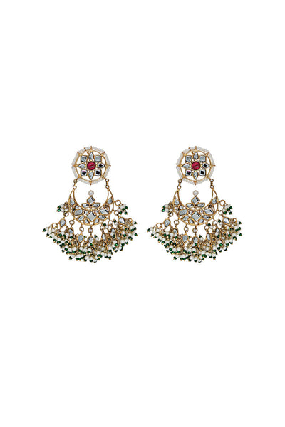 The traditional style chandbaali kundan earrings with red ruby chatham on the centre heavy faux pearl piroyi to create a look that is mystical and alluring.