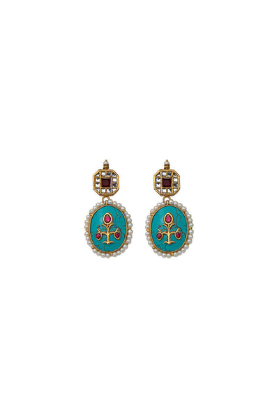 Kundan Work Turquoise stone Pearl piroyi Handcut white and red glass stone on the top Hand made 21K gold plated Stud back with sterling silver pin Alloy metal Made in Pakistan