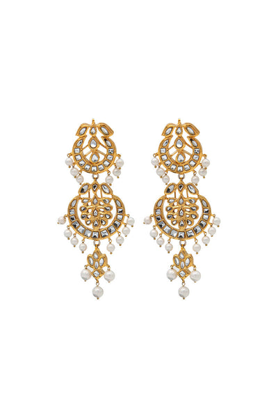 Traditional two-tiered thappa kundan earrings with chaand motif inspiration bejeweled with handcut glass stones and dangling pearl piroyi. 21K gold plating and pearl saharas finish the look.