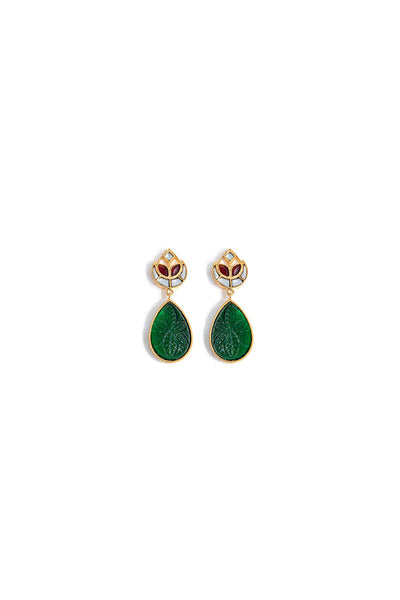 It's modern, bold and makes for an instant upgrade to your jewelry closet - we bring you statement earrings with hancut glass stone motifs that sits atop a carved green onyx & teal blue stone hanging. Available in two colors.