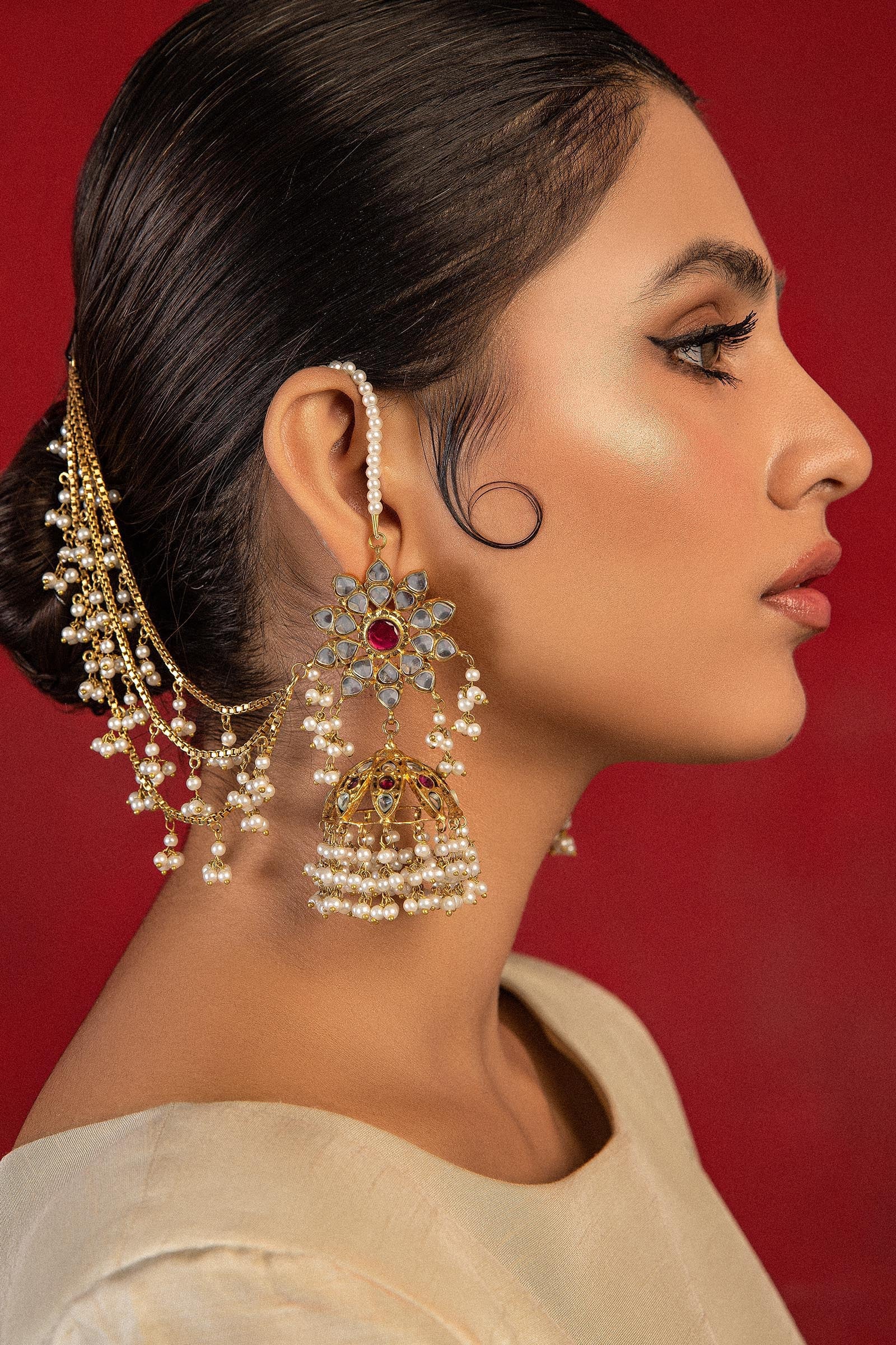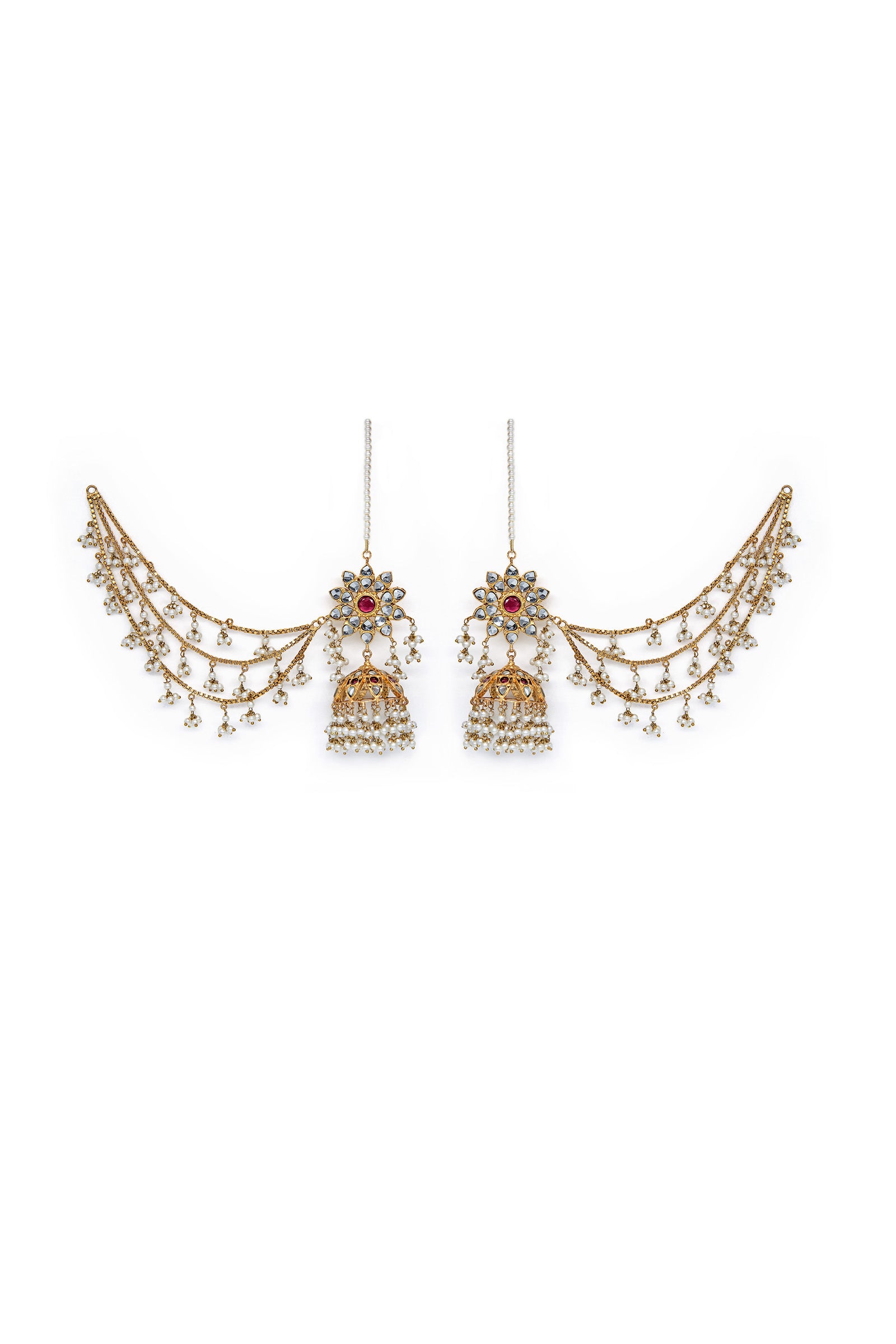 Handcrafted kundan jhumka earrings with a floral motif encrusted with ruby red stones, paired with handcut glass stones with a cluster of pearl piroyi hangings in 21K gold plated finish. Adding embellised sahara to give a maharani look. a. Embellised sahara b. Suppporting sahara. Alloy metal