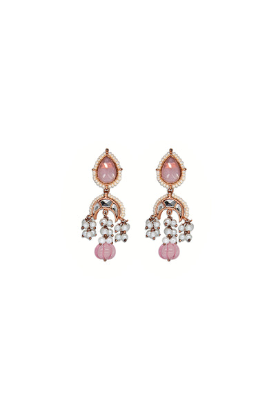 A traditional dangling earring with pearls piroyi and carved hanging stones are a timeless jewlery box essential. Style our designer earrings encrusted with pink quartz pear shaped stone to elevate your style.