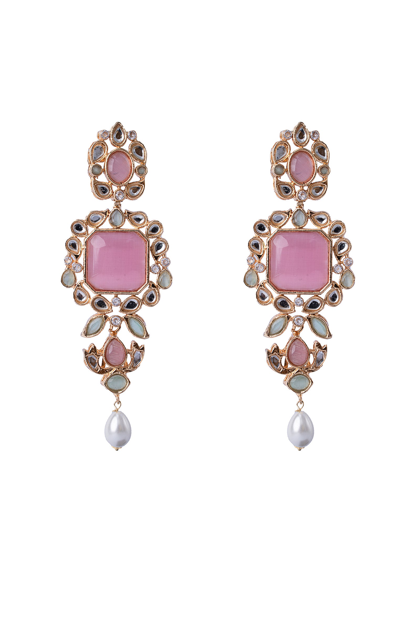 Dazzle in our contemporary yet classy Mayall Earrings - Featuring pink cat's eye stone surrounded by an artful amalgamation of handcut white glass stones and white zircons, adding the finishing touch with a hanging drop pearl. This masterpiece is perfect to glam up your festivities and formal events. Finish: 21K Gold Plated Back Pin: Sterling Silver Stud Product Care: Wipe Clean
