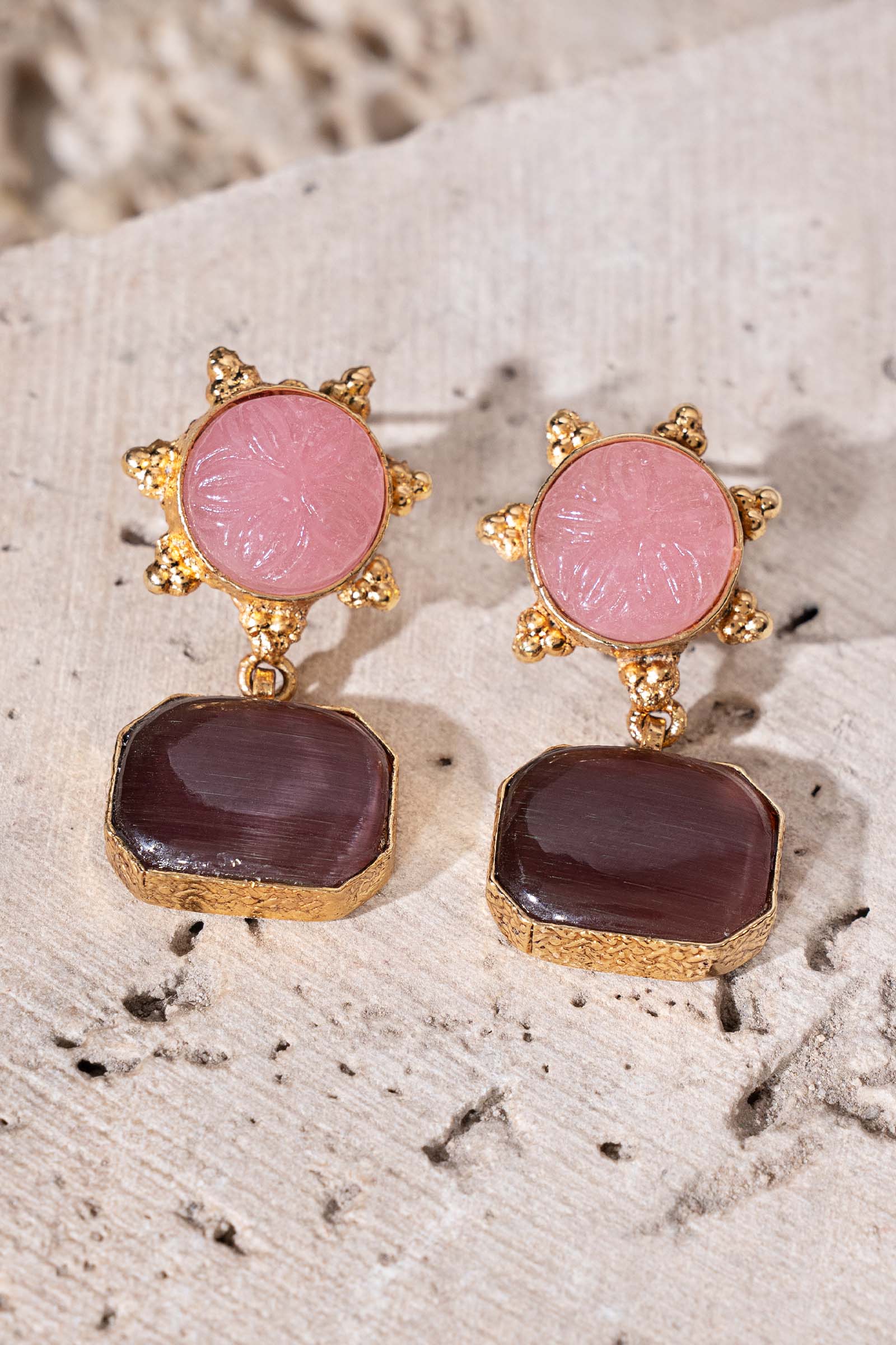 An ode to refined artistry, the Opaline Earrings are sculpted in an artfully composed metal frame, where delicate handwork meets masterful craftsmanship. Blushed pink and luminous purple cat’s eye stones shimmer with quiet depth, their soft glow enhancing the textured surface. Poised within a modern silhouette, they embody serene elegance - designed to elevate moments that call for understated luxury.